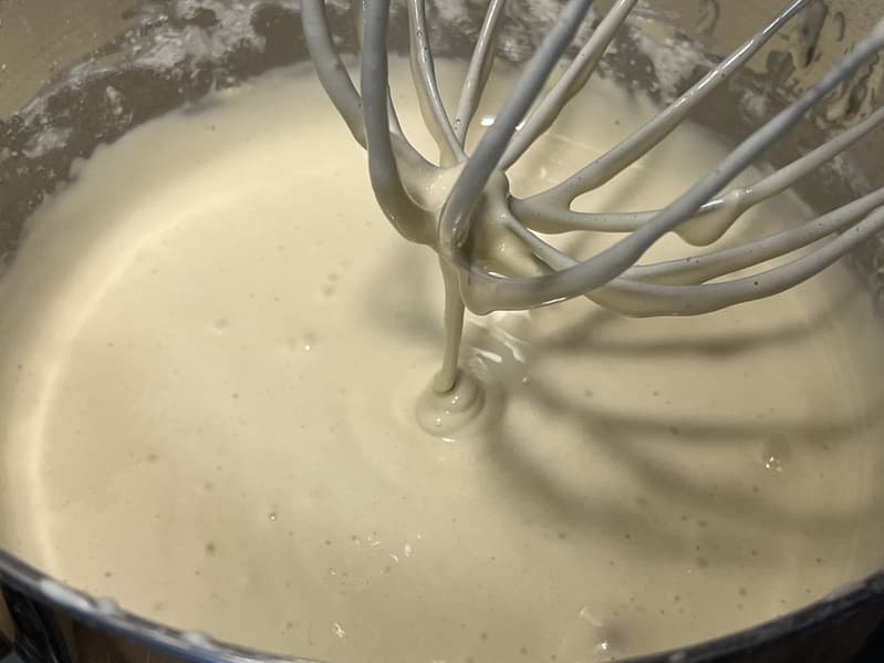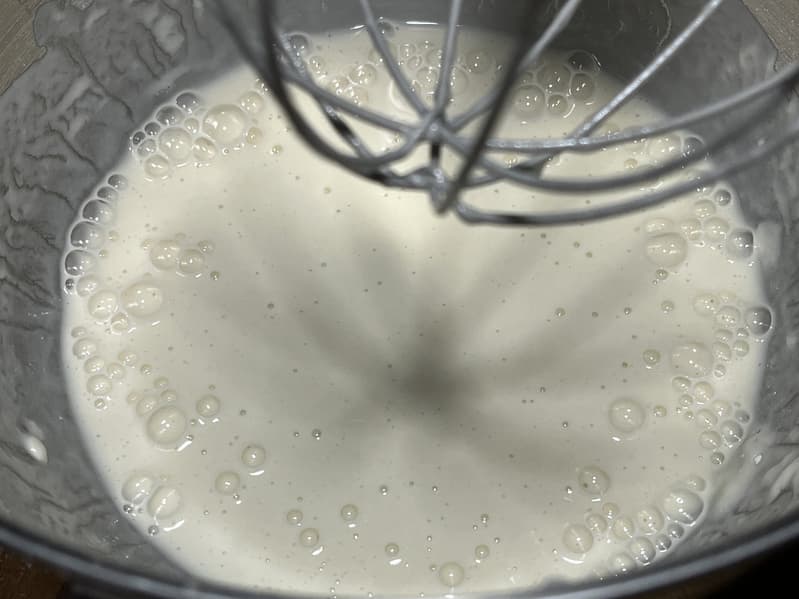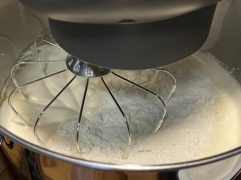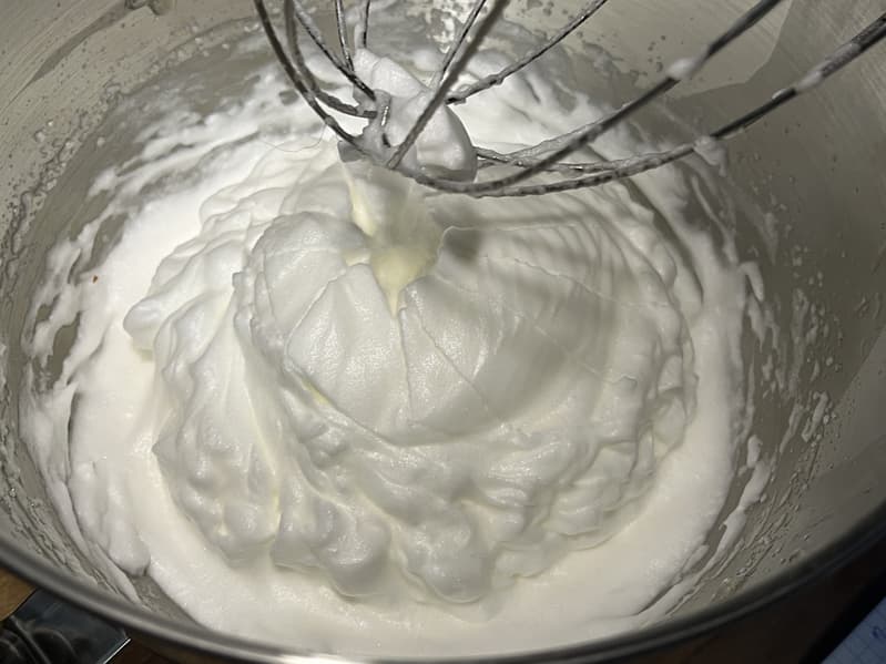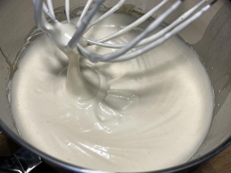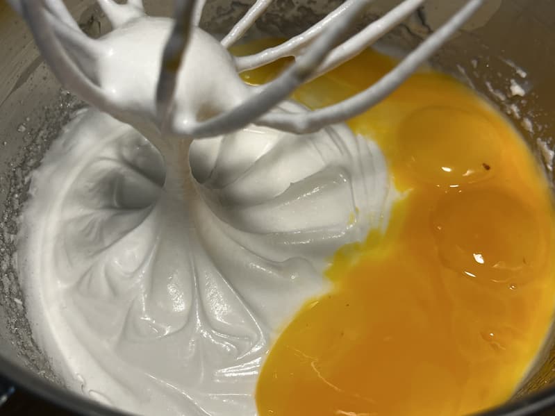 Белки взбились отлично, после чего мы вернули к ним желтки, добавили сахар и отправили взбиваться на 5-й скорости еще 1,5 минуты.