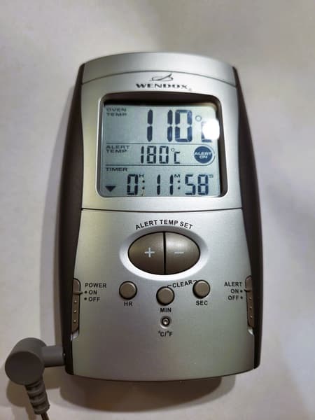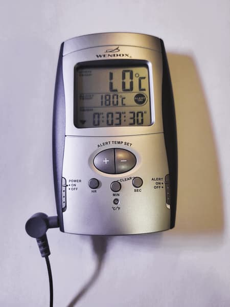 В нашей духовке температура задается с помощью вращающейся ручки, что не позволяет выставить точно желаемое значение. Впрочем, нельзя сказать, что показания духовки и термометра Wendox W3570-S сильно разошлись: температура в духовке была выставлена примерно на 180 градусов, термометр показал максимальную температуру 186 °C, а звуковой сигнал, как и должно быть, раздался при достижении температуры 180 °C.