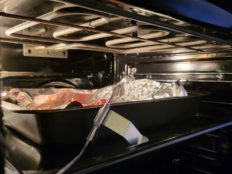 На фото ниже мы видим сенсор термометра, установленный в духовом шкафу с готовящимся блюдом.