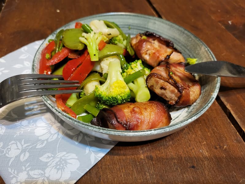 Мы решили проверить температуру в нашей электрической духовке. Установили температуру в 180 °C и отправили в духовку медальоны из свинины, обернутые беконом.