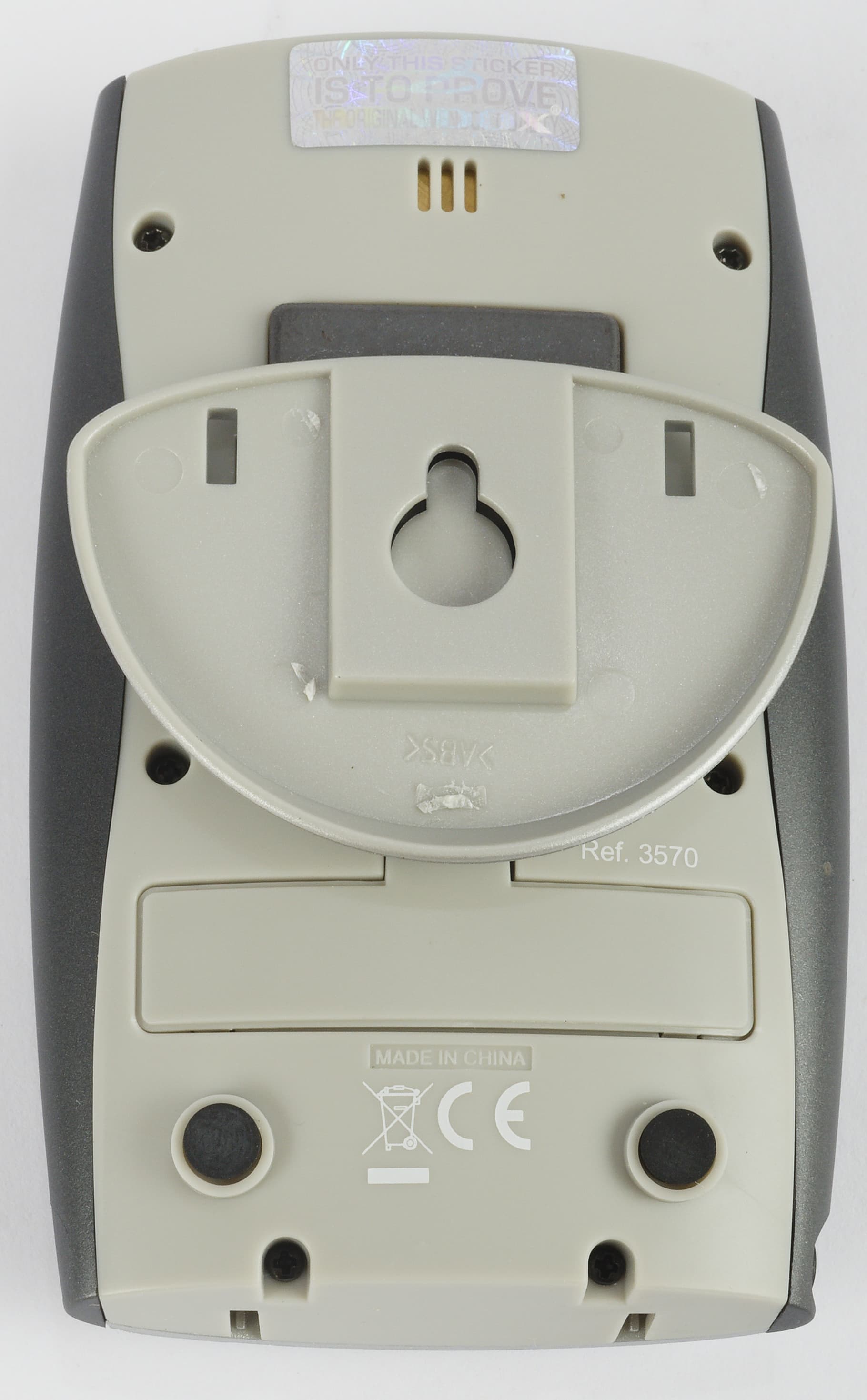 Но когда мы вытащили крепление для стены, под ним мы обнаружили магнит, с помощью которого термометр можно закрепить на ближайшей металлической поверхности. Также внизу под магнитом обнаружился отсек для батарейки и шильда с информацией о производителе прибора.