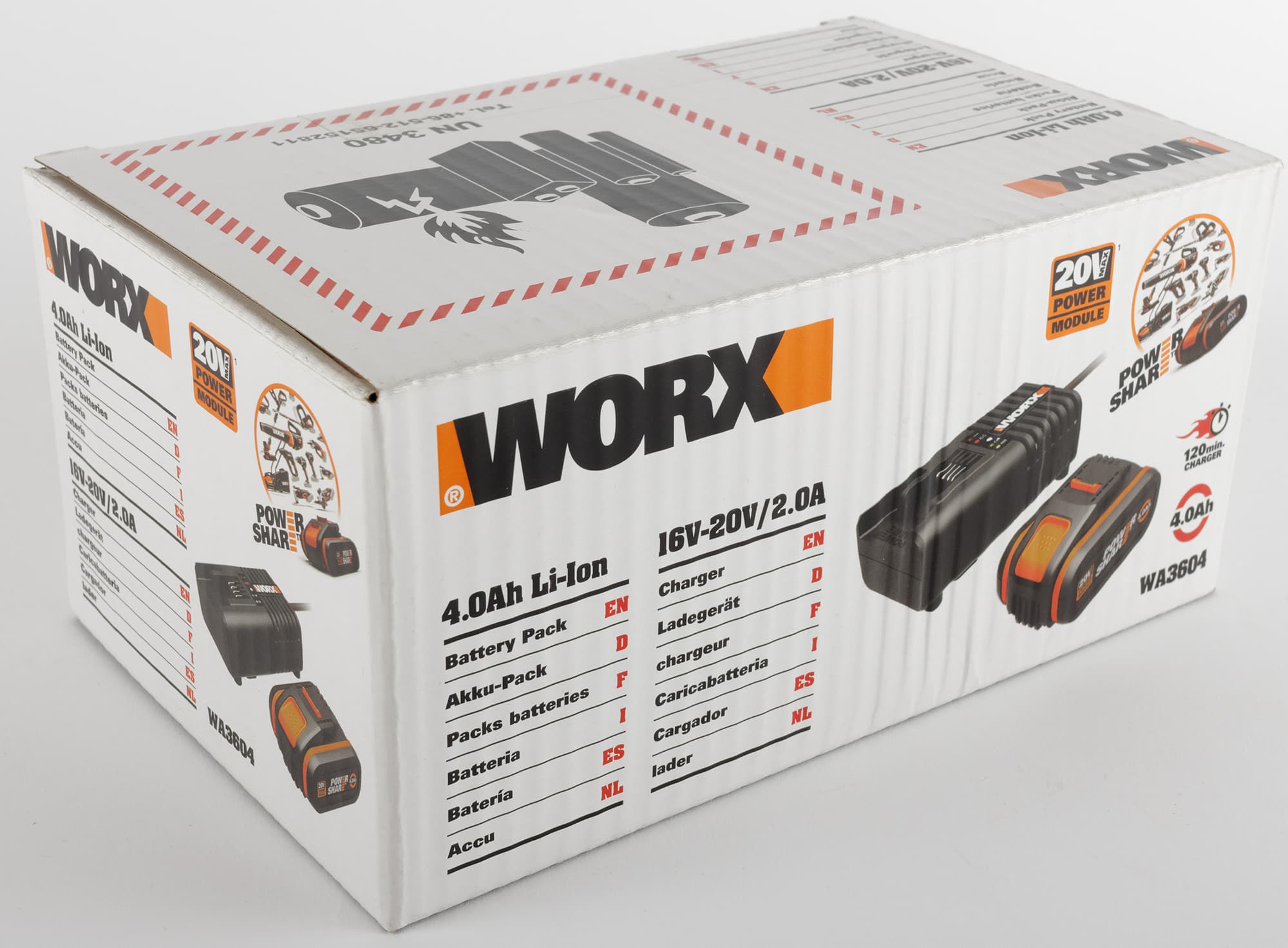 Комплект упакован в небольшую коробку из ламинированного картона с полноцветной печатью. На ее передней стороне, помимо логотипа производителя, мы видим изображение зарядного устройства и батареи, лого линейки PowerShare и основные характеристики устройств: емкость, тип аккумулятора, параметры выходного напряжения. Задняя сторона содержит информацию о маркетинговых особенностях модели: совместимость с двухамперными батареями этого же производителя, светодиодный индикатор уровня заряда и совместимость с 16-вольтовой, предыдущей, линейкой аккумуляторов Worx.