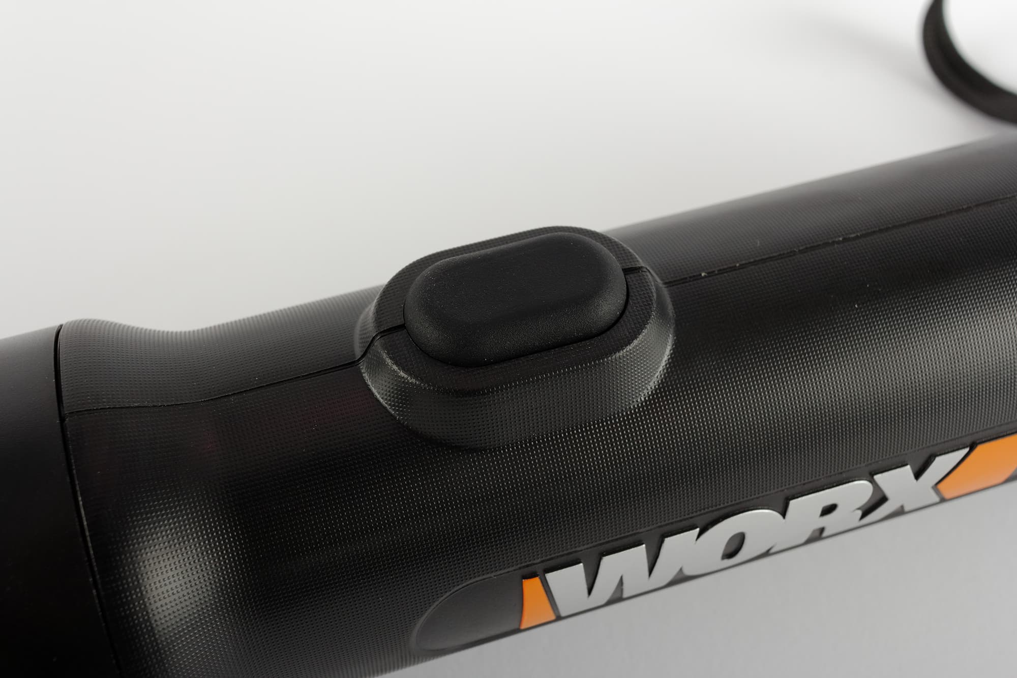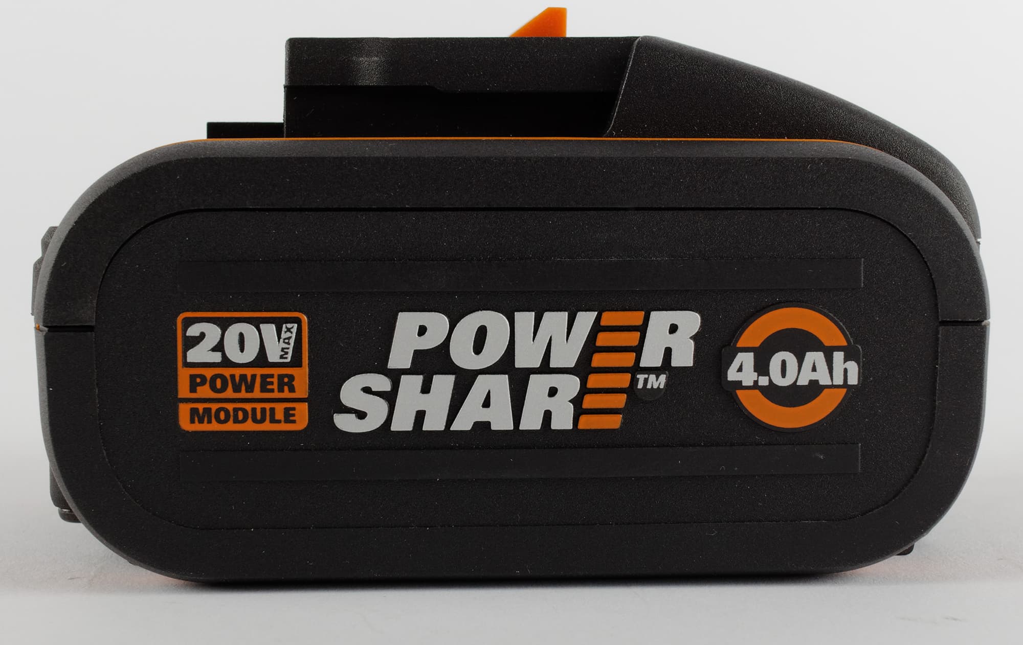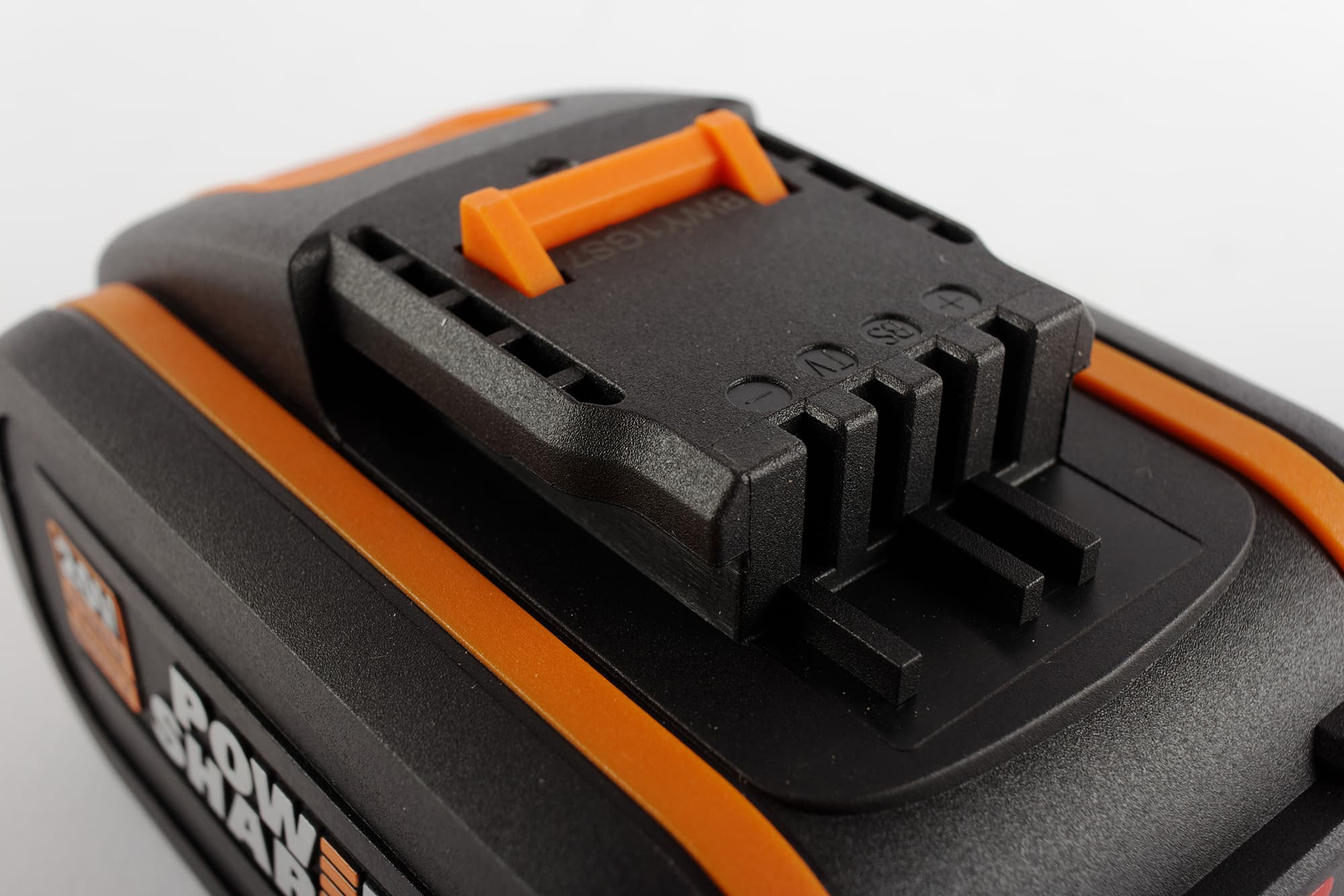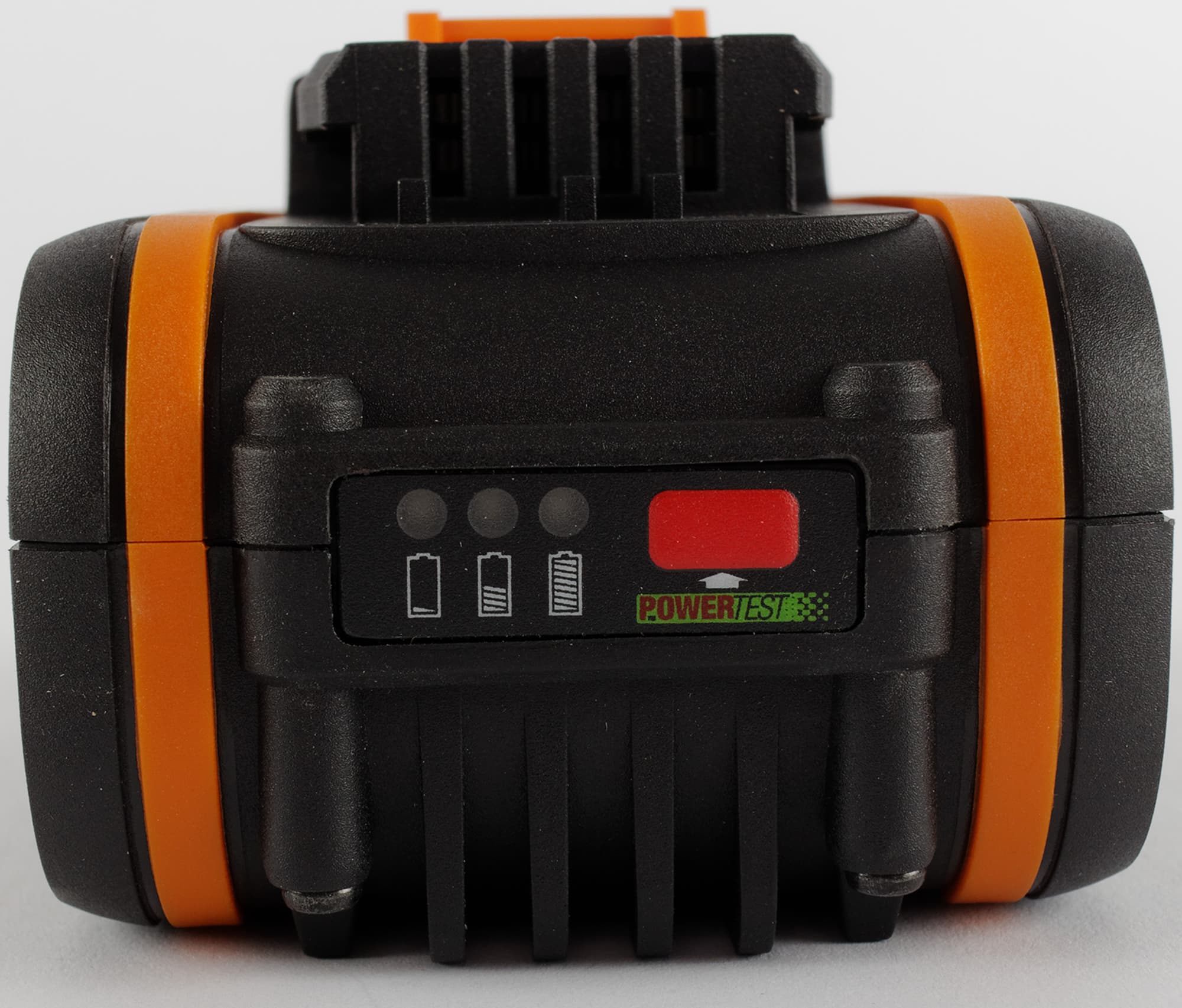 Корпус аккумулятора выполнен из приятного на ощупь пластика и оформлен в фирменной черно-оранжевой гамме. Из верхней крышки батареи выступает оранжевая защелка — стандартный для Worx фиксирующий механизм. Управляется она крупной клавишей того же цвета.