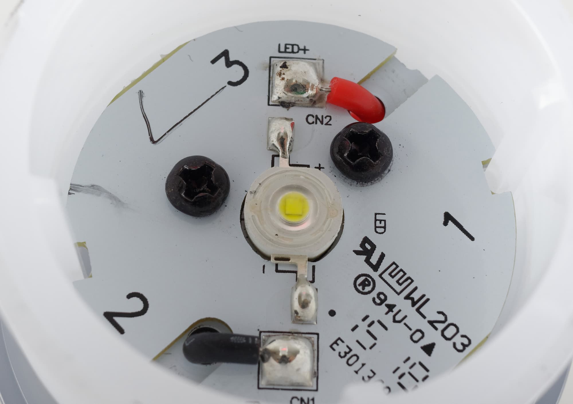 Источником направленного света служит светодиод средней яркости и холодного оттенка, размещенный на плате под отражателем.