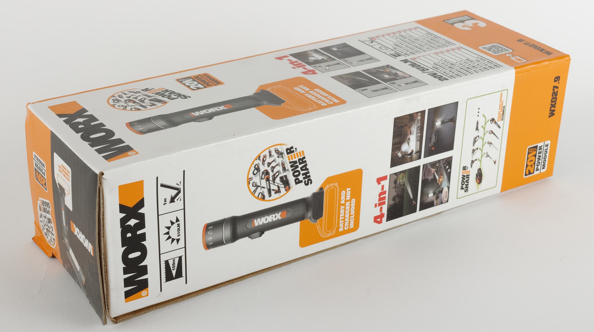Фонарь упакован в небольшую прямоугольную коробку из ламинированного картона с полноцветной печатью. На ее боковых сторонах мы видим изображение устройства, логотип производителя, лого линейки PowerShare (фонарь рассчитан на использование стандартного для техники Worx формата питания, совместимого со множеством приборов этого производителя), а также четыре фотографии, иллюстрирующие все конфигурации: направленный и рассеянный источники света, режим настольной лампы и подача сигнала SOS.