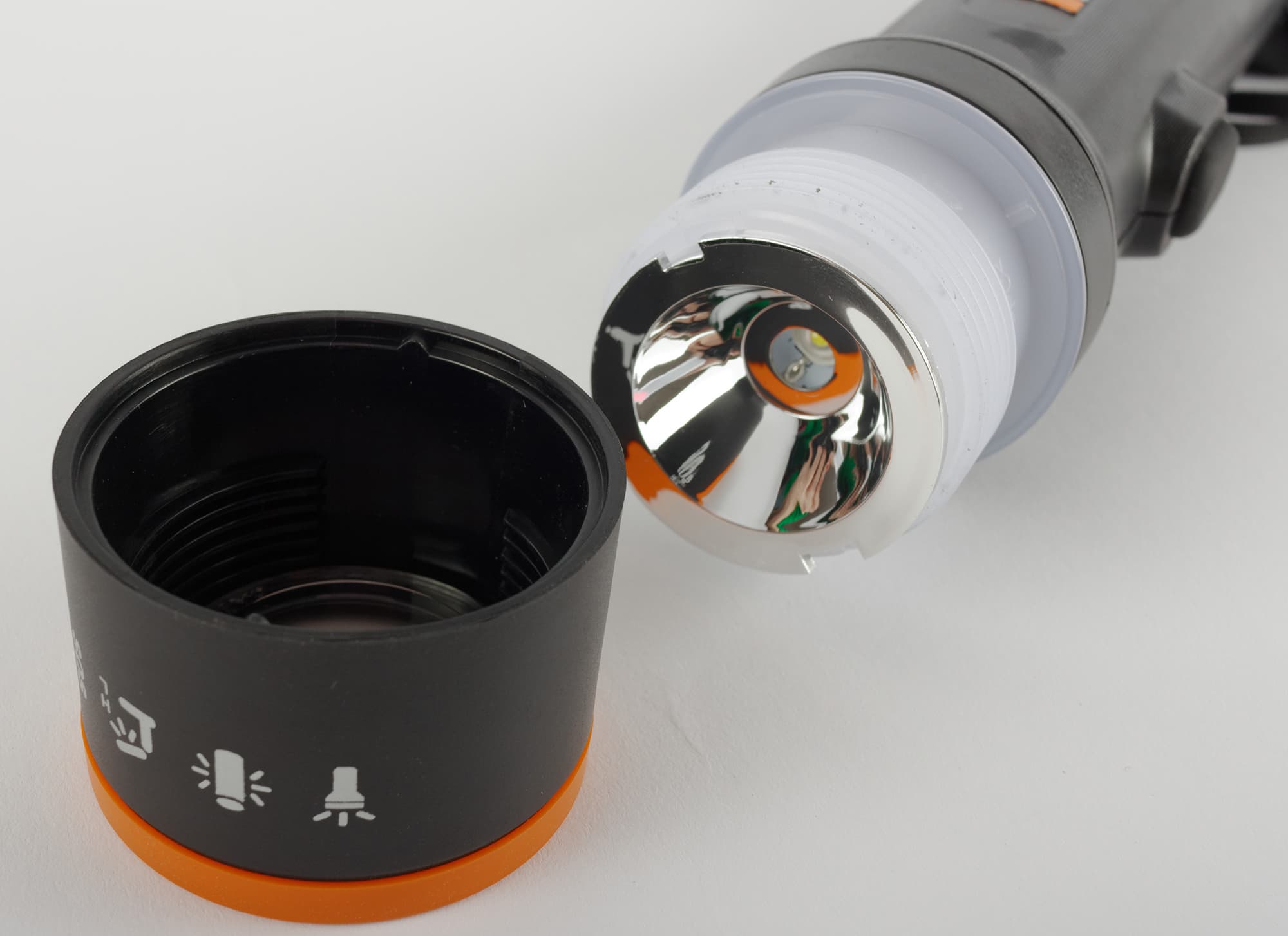 Чтобы сделать из ручного фонаря источник ненаправленного света, необходимо потянуть за головку и выдвинуть из корпуса белый матовый плафон, внутри которого располагаются несколько линеек светодиодов.