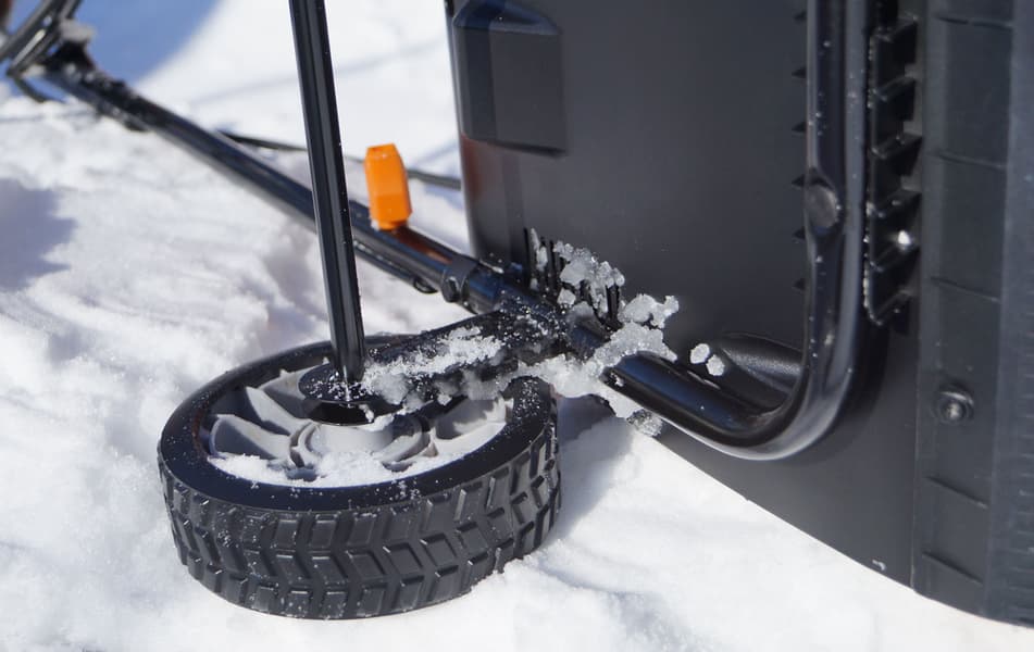 Всегда следите за направлением струи выбрасываемого снега. Вместе со снегом может вылететь камень или другие твердые объекты. А они летят гораздо быстрее и дальше, чем пушистый снег. И если в это время выпускной желоб направлен на людей, окна или автомобили, то результат нетрудно спрогнозировать. Если же во время работы вы ощутили удар или вибрацию — следует немедленно остановить двигатель и произвести осмотр шнека.