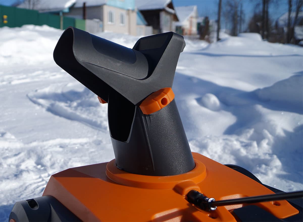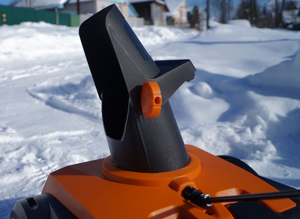Наклон направляющей желоба не менее важен, чем угол поворота. Если поворот определяет направление выброса снега, то наклон направляющей регулирует высоту выброса. Здесь диапазон ограничивается 45 градусами. Ну а больше и не требуется, зачем? Вы же не снежный фонтан хотите сделать, а всего лишь отбросить снег подальше.