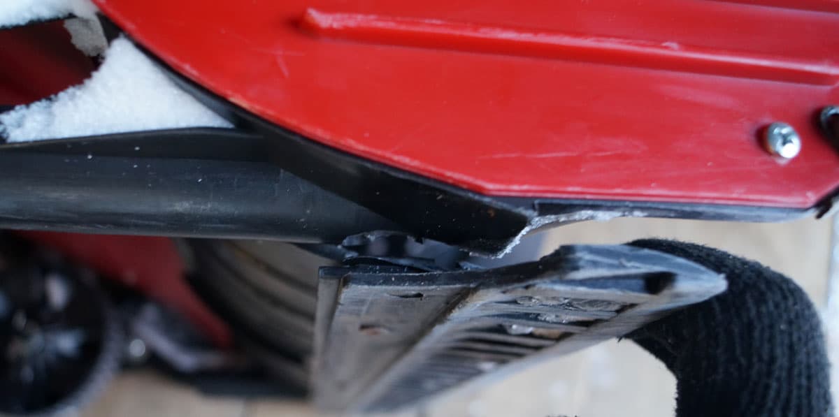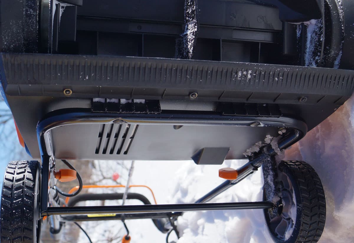Но, помнится, у нас имелись вопросы относительно конструкции этого снегоуборщика. Первый вопрос: пластиковый скребок. Именно эта деталь прежде всего встречает сопротивление снежной массы.