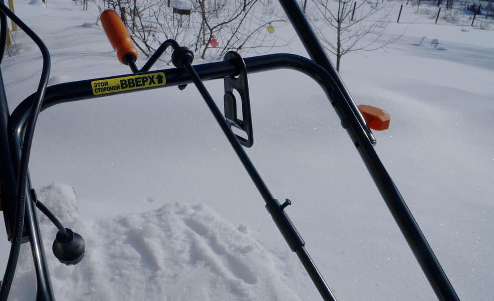 Кстати, упоминавшийся старый снегоуборщик (который имеет ранения) мощнее рассматриваемого на 100 Вт, однако подобным выбросом похвастать не может. Более того, двигатель этого старого снегоуборщика автоматически останавливается, если шнек встречает слишком сильное сопротивление. То есть в глубокий сугроб машину не повтыкаешь. А вот рассматриваемый снегоуборщик продолжает работать, даже если погружен в снежную массу по самую крышу.