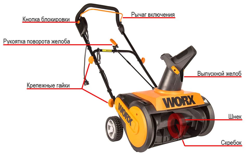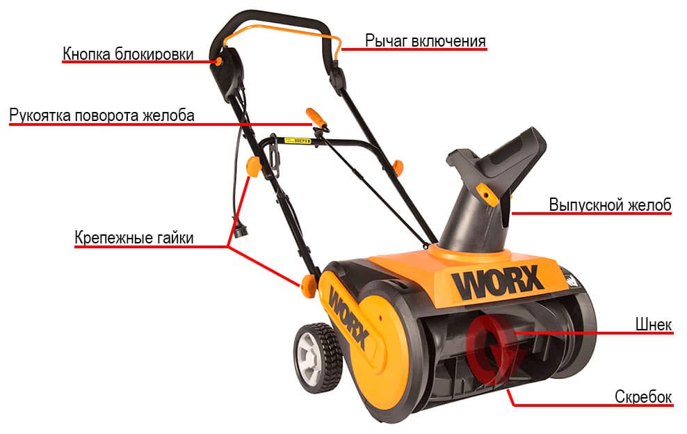 Рассматриваемая машина относится к типу электрических проводных снегоуборщиков со скребком и вращающимся шнеком, который обеспечивает захват и вертикальный выброс снежной массы. Понять конструкцию проще всего с помощью схемы, где обозначены все важные детали, а полупрозрачной стрелкой показано направление вращения шнека.