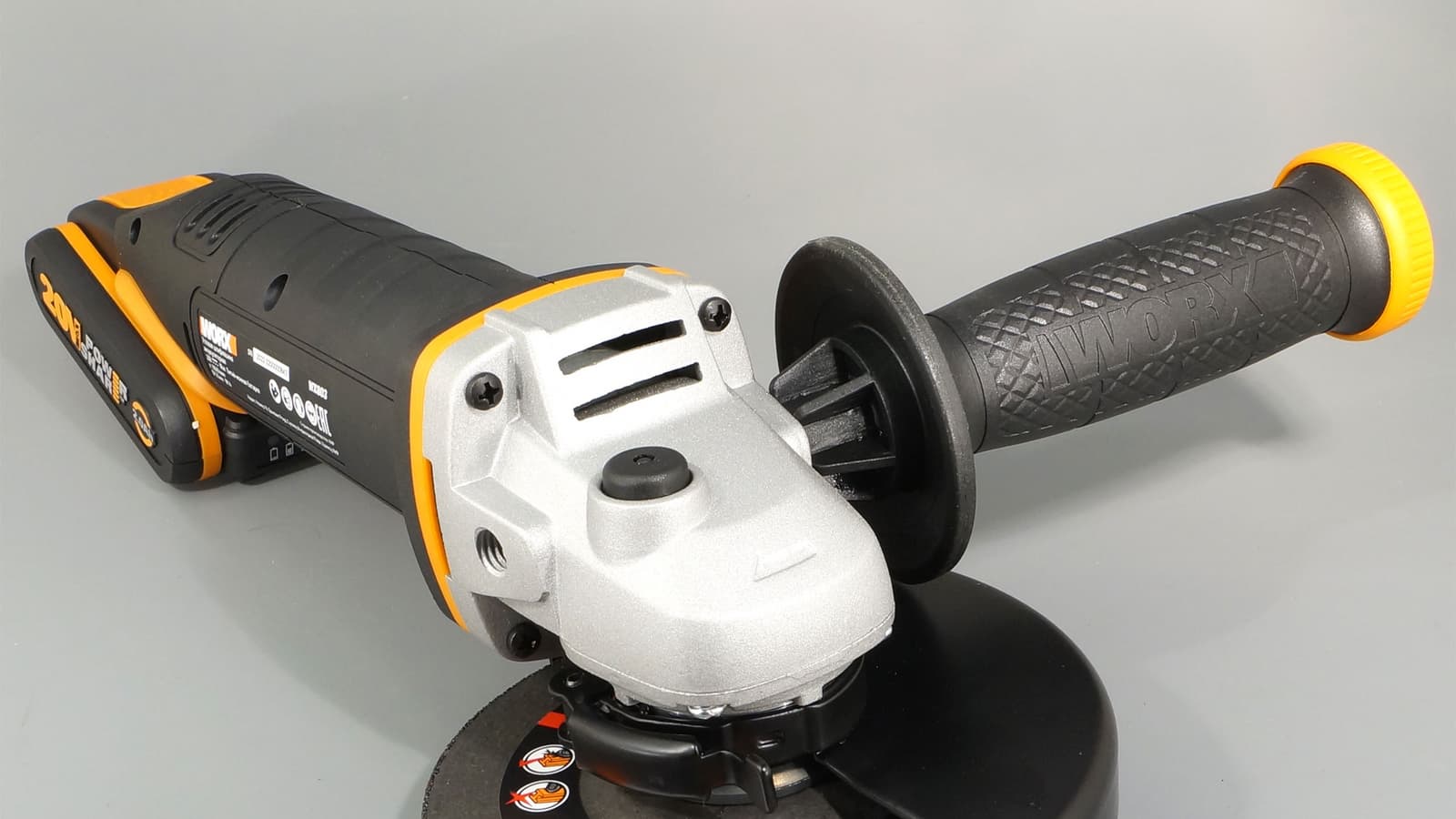 Поскольку болгарка не снабжается аккумуляторами, мы оказались свободны в выборе. Подойдет 20-вольтовая батарея Worx любой емкости, но для инструмента, который отличается повышенным энергопотреблением, разумнее будет использовать аккумулятор потолще, 4 А·ч.