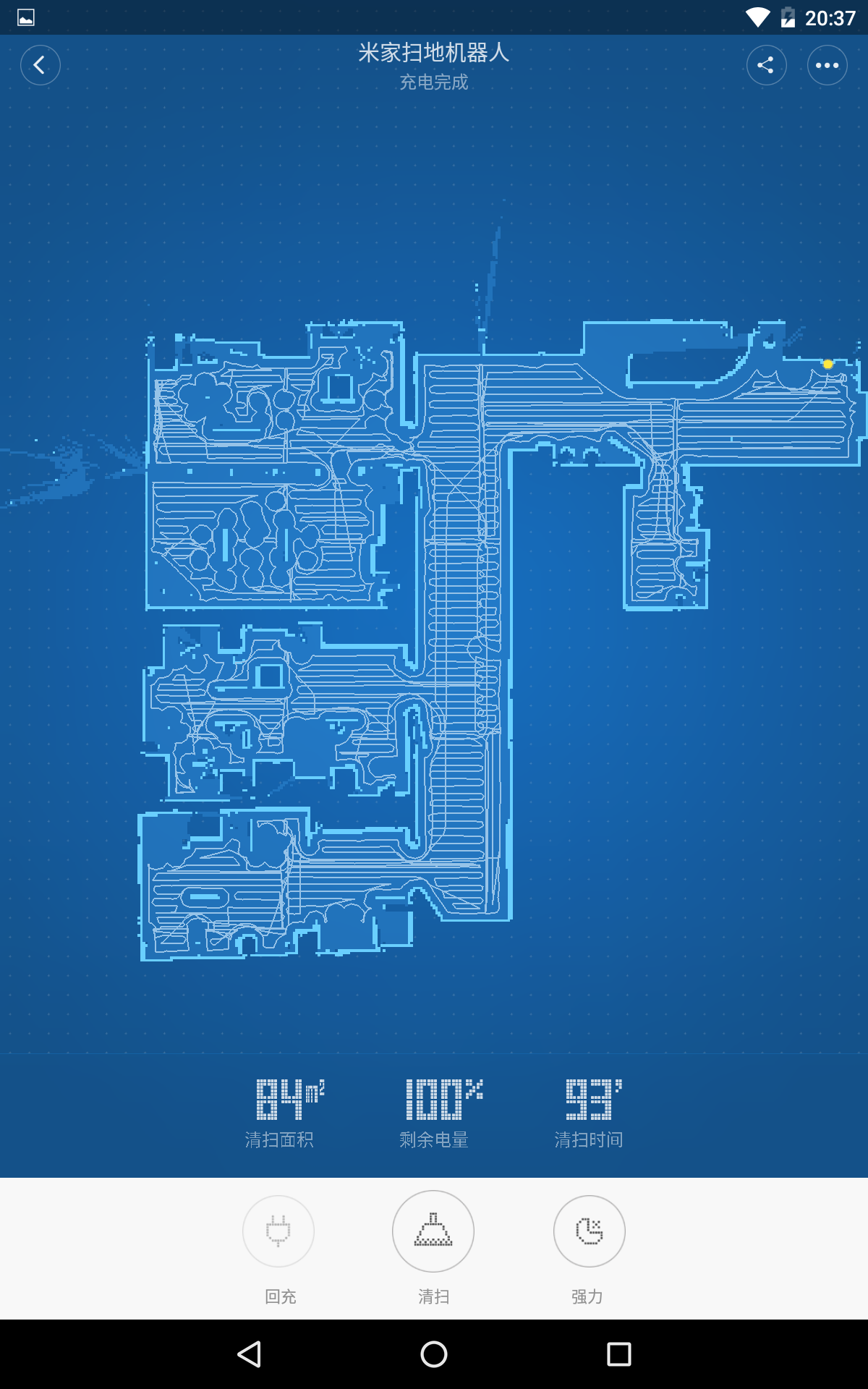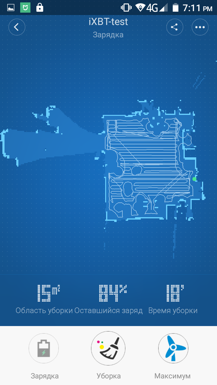 Убирал робот 93 минуты. В случае такого большого помещения робот разбивает его на участки размером примерно 3,5 на 3,5 м, повторяя в каждом один и тот же цикл — обход участка по периметру, затем змейкой обход внутренней площади участка и переход к следующему участку. Как и все побывавшие у нас на тестировании роботы с навигацией Xiaomi Mi Robot Vacuum не оперирует такими понятиями как комната и стены, с его точки зрения есть какая-то доступная площадь и препятствия на ней, как робот обойдет эту площадь определяется порядком обнаружения препятствий и алгоритмом уборки, на реальные комнаты робот площадь не делит. По данным из приложения, убранная площадь составила 84 м², но напомним, что из указанных нами 110 м² нужно вычесть значительную площадь, занимаемую мебелью и оборудованием. По данным из приложения, работ закончил с уборкой с зарядом на уровне 38%, но из-за проблем с обновлением информации эти данные могут быть недостоверными. Так в дополнительных тестах на той же мощности вентилятора робот от полного заряда до уровня в 19% (напомним, что при уровне ниже 20% робот перестает убирать и возвращается на базу) проработал 103 минуты. То есть на одном заряде в режиме максимальной мощности робот убирает на площади примерно в 120 м². С учетом одной подзарядки (а в явном виде нигде не сказано, сколько раз робот может подзаряжаться и самостоятельно возобновлять уборку) в этом режиме робот может убрать до 240 м². В режиме с пониженной мощностью вентилятора максимальная площадь, соответственно, увеличивается.