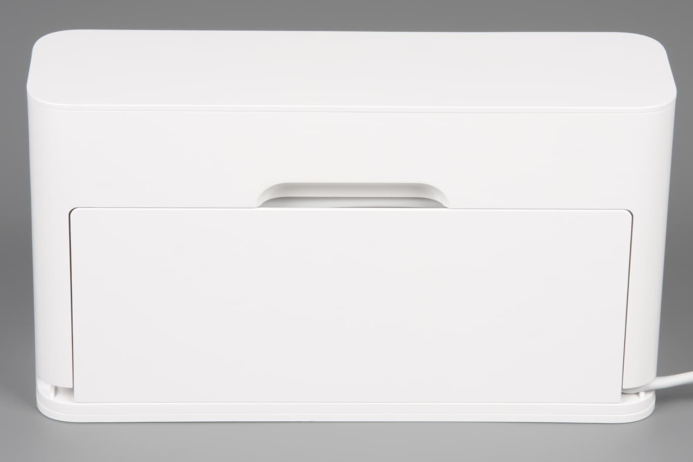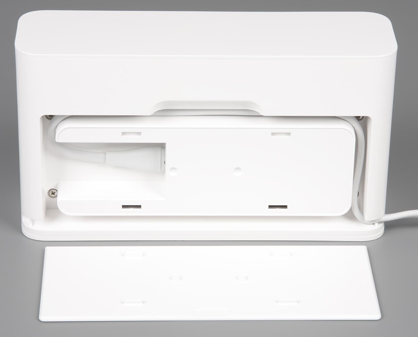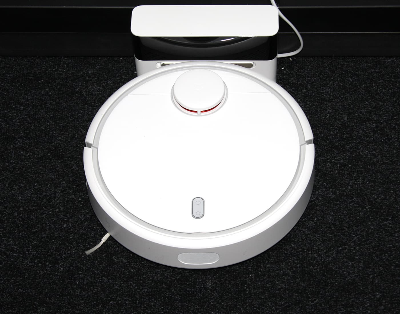 Такая конструкция гарантирует надежный контакт робота с базой даже при слегка кривоватой парковке. При нажатии контактные площадки не только утапливаются, но и смещаются вбок, что способствует очистке контактирующих поверхностей. Блок питания встроен в базу. Сетевой кабель питания отсоединяемый (используется двухштырьковый разъем с цилиндрическими контактами). Излишки кабеля питания укладываются в специальный канал сзади на базе.