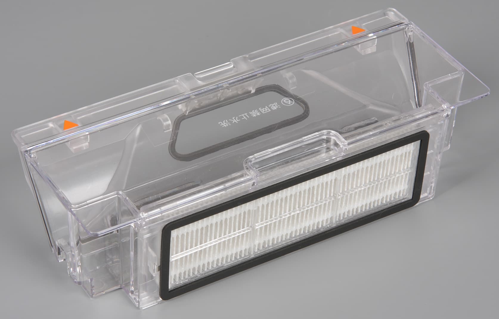 Корпус пылесборника изготовлен из прозрачного пластика. Однако крышка верхней панели непрозрачная, поэтому, не приподняв ее, невозможно оценить фактическое заполнение пылесборника. Датчика переполнения пылесборника, видимо, нет, объем пылесборника относительно небольшой, поэтому пользователю придется часто заглядывать под крышку. Спереди у пылесборника есть крышка, которую нужно откинуть при очистке этой емкости. Задний торец пылесборника заглушен воздушным фильтром. Для исключения паразитного подсоса воздуха стыки патрубка и пылесборника, а также фильтра и всасывающей решетки оснащены упругими уплотнителями. Судя по перечеркнутой капельке, пылесборник запрещено мыть.