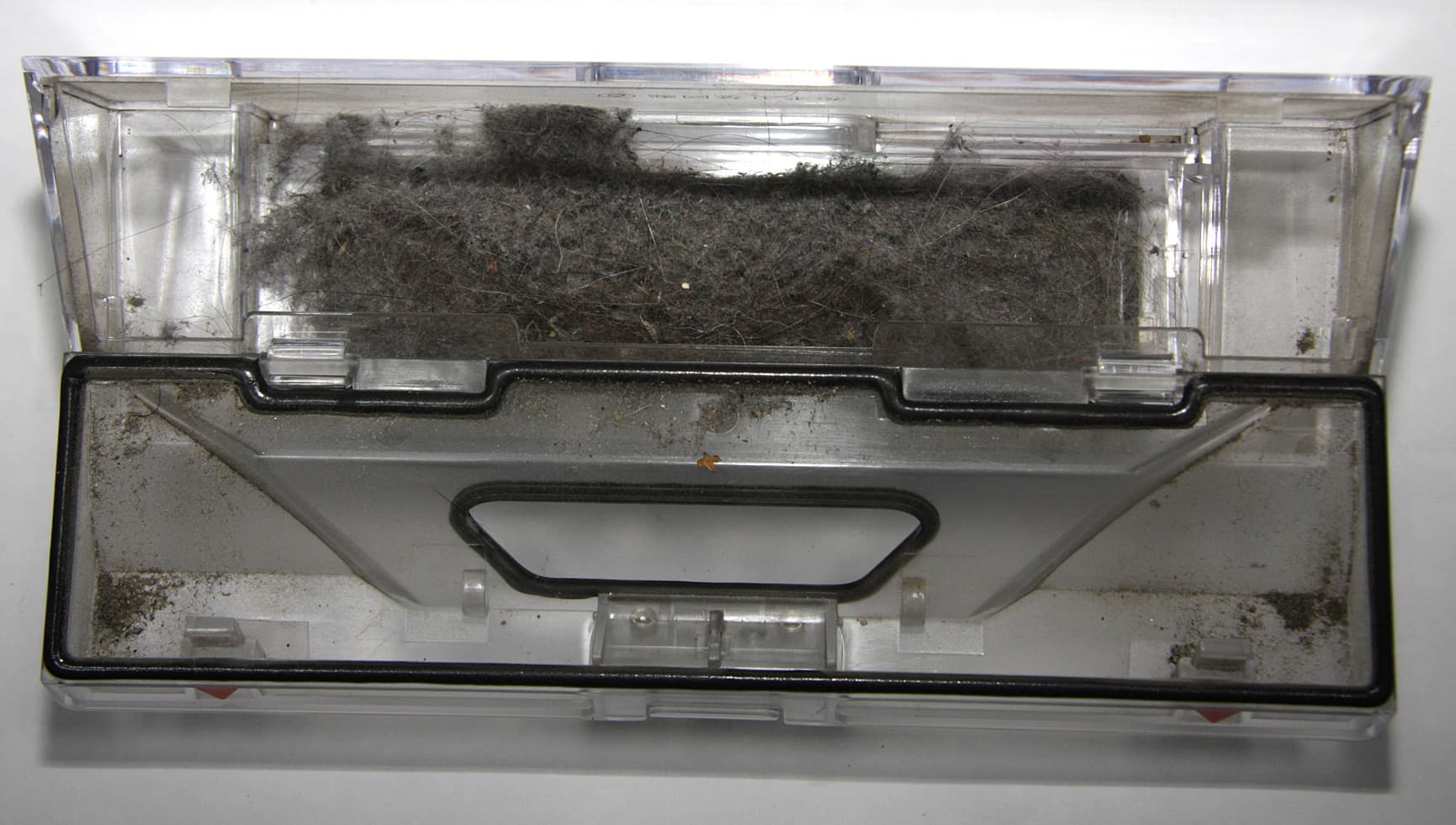 Проще всего, с нашей точки зрения, очищать пылесборник и фильтр с помощью обычного пылесоса с щелевой насадкой. Впрочем, это замечание относится ко всем роботам-пылесосам. Боковая щеточка ничего на себя не намотала, а на основную щетку немного волос намоталось и на щетинках стали образовываться колтуны из пыли.