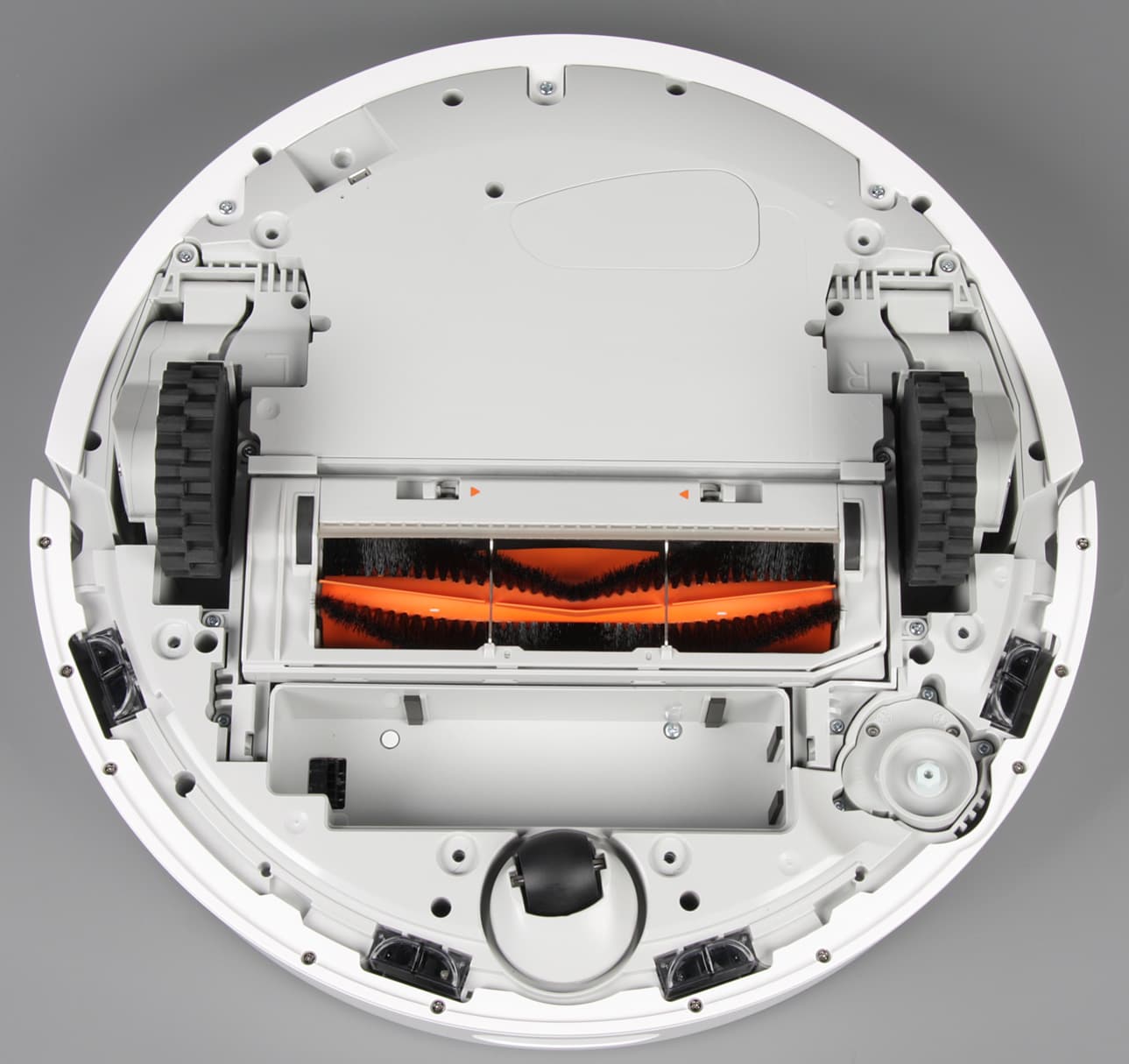 Перевернув пылесос вверх днищем, мы увидим четыре ИК-датчика перепада высоты (темные окошки по краю спереди и перед ведущими колесами), ролик на вращающейся платформе, боковую щетку, отсек с основной щеткой, закрытый рамкой с ограничительными направляющими (уголки ковров не наматываются) и с дополнительным упругим неподвижным скребком, и два ведущих колеса на подпружиненных рычагах. Неприметная крышечка скрывает разъем Micro-USB, используемый, видимо, для диагностики и контактного способа обновления прошивки.