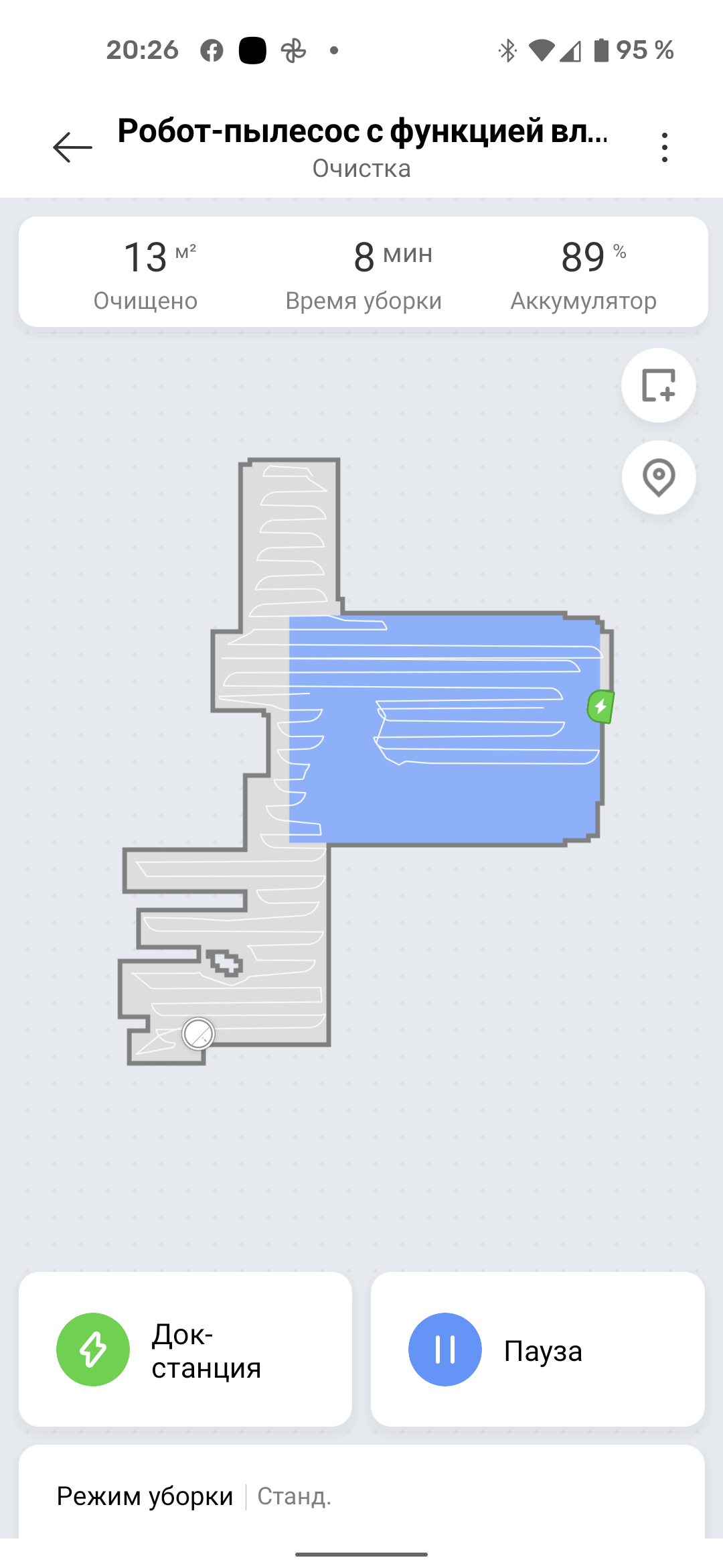 Во время второй уборки пылесос почти в точности повторил собственный маршрут, обойдя помещение за 8 минут 24 секунды и увеличив количество собранного мусора до 95,5%.