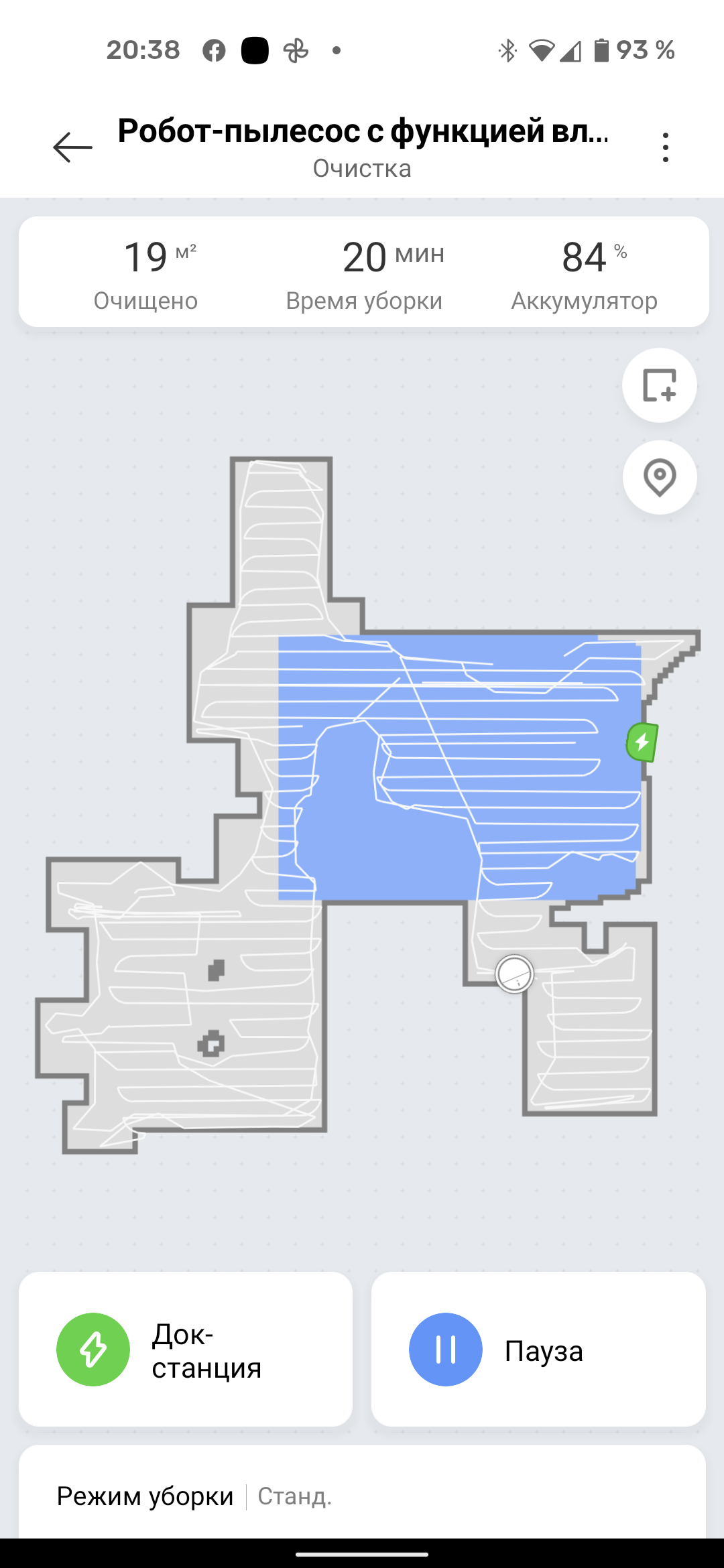 В режиме влажной уборки эта модель равномерно, без разводов и капель, протирает поверхность. Наличие моющего модуля пылесос определяет автоматически: в приложении становится доступен режим мойки, при котором работает подающий воду насос, а мощность всасывания снижается.