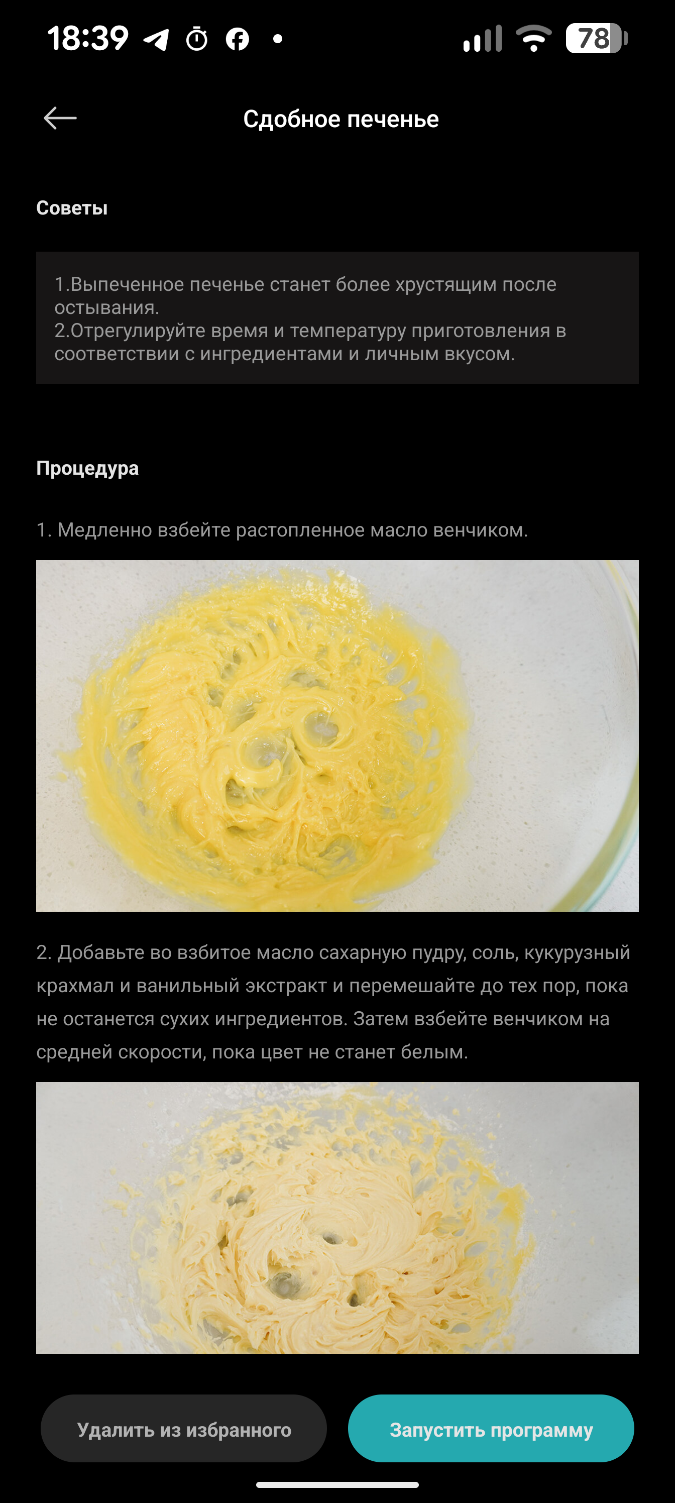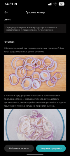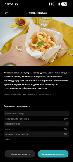 Каждый рецепт содержит список ингредиентов с подробным иллюстрированным описанием стадий приготовления и завершается фотографией с вариантом сервировки. Кнопки в нижней части экрана позволяют внести блюдо в избранное и запустить программу в нужном режиме на требуемое время.