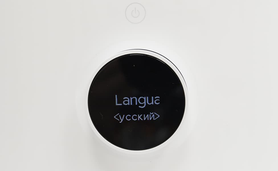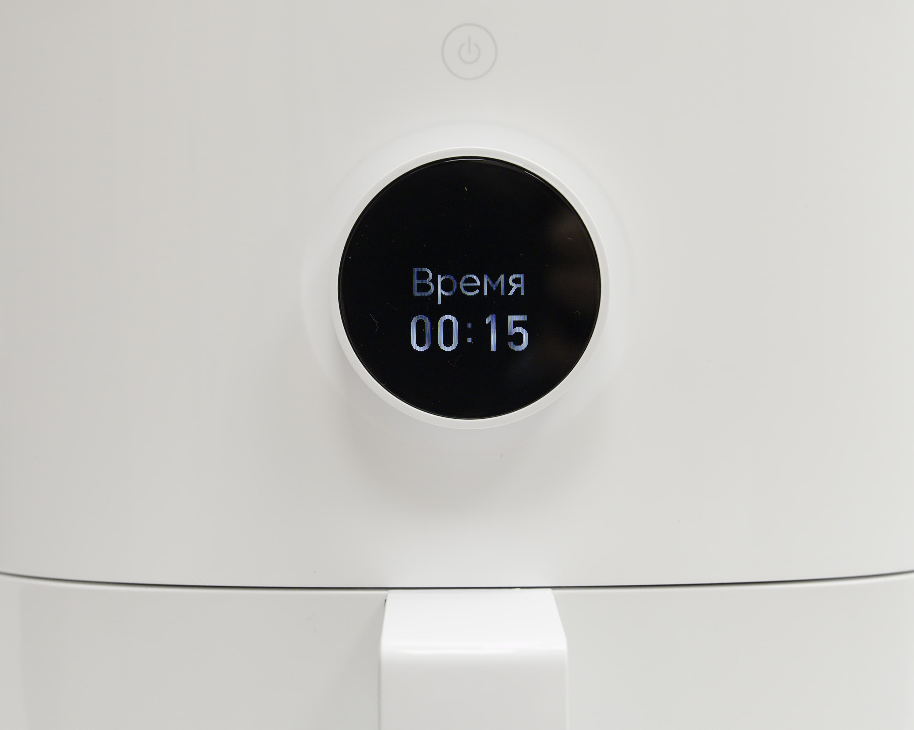 Чтобы вывести аэрогриль из режима сна, следует прикоснуться к сенсорной кнопке в верхней части передней панели. «Проснувшееся» устройство включает на ручке управления круглый монохромный TFT-дисплей и ждет указаний.