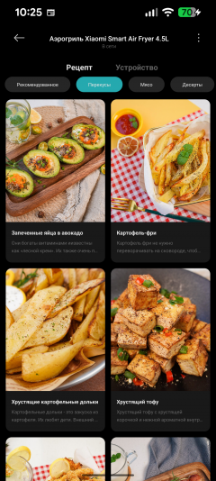 Коллекция рецептов, адаптированных для аэрогриля, поделена на разделы: «Перекусы», «Мясо» «Десерты», «Фрукты и овощи», «Морепродукты» и «Основные продукты питания» — по 15-20 блюд в каждом. Самые популярные из них отображаются на вкладке «Рекомендованное».