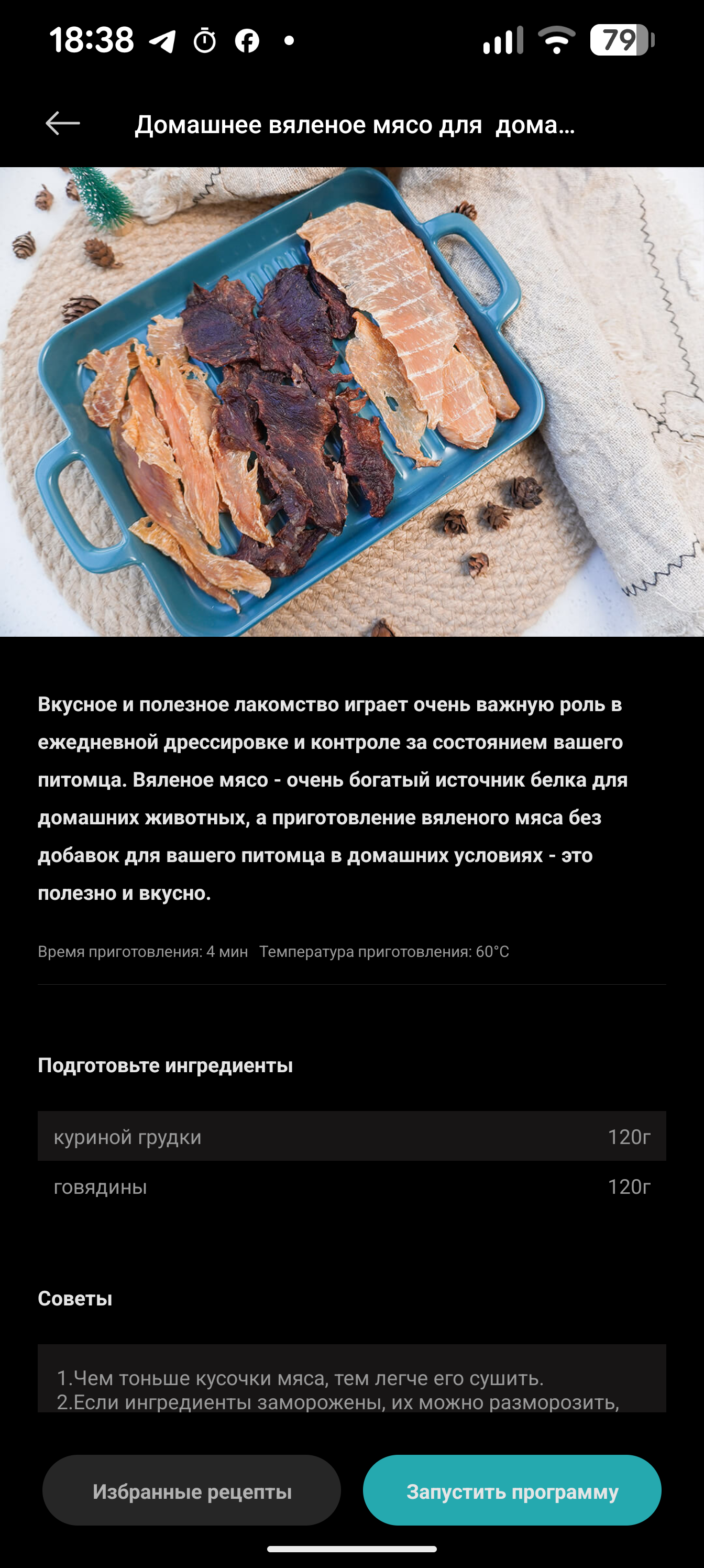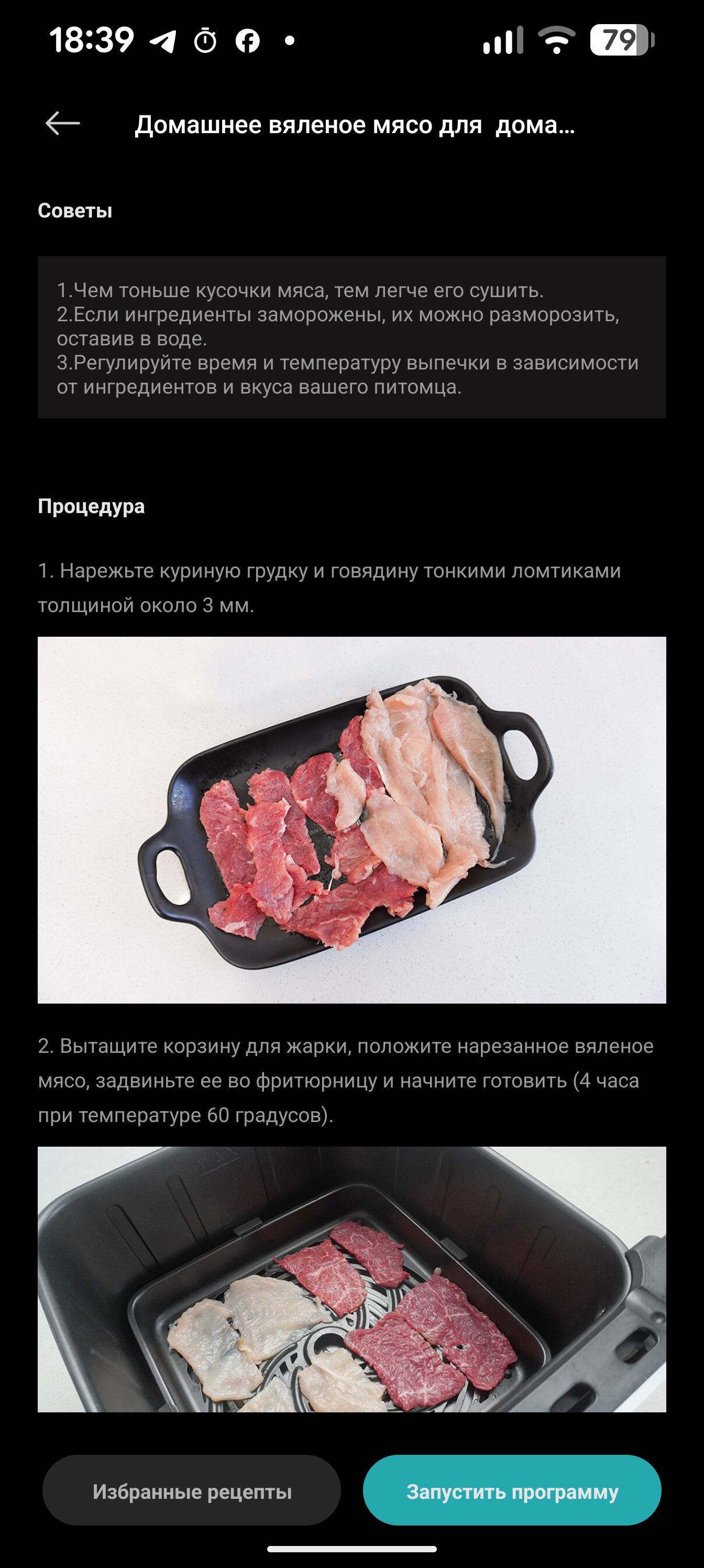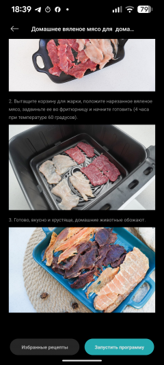 Около 200 г говяжьей вырезки мы выдержали в маринаде из оливкового масла, пряностей и соли, нарезали тонкими полосками и разложили на решетке. Запустив программу из приложения, мы обнаружили в сценарии ошибку: вместо логичных 4 часов при температуре 60 °C аэрогриль проработал всего четыре минуты (в текстовом описании время указано правильно). К счастью, приложение позволяет скорректировать параметры приготовления, но на будущее стоит иметь в виду: рецепты могут содержать ошибки, слепо доверять им не стоит.