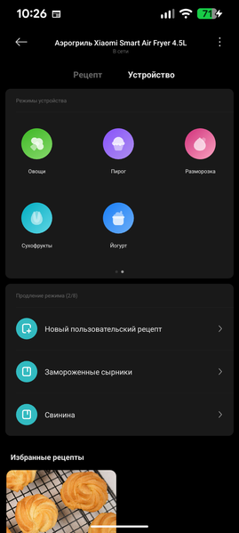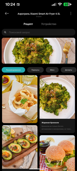 На основном экране Smart Air Fryer мы видим две вкладки: «Рецепты» и «Устройство».