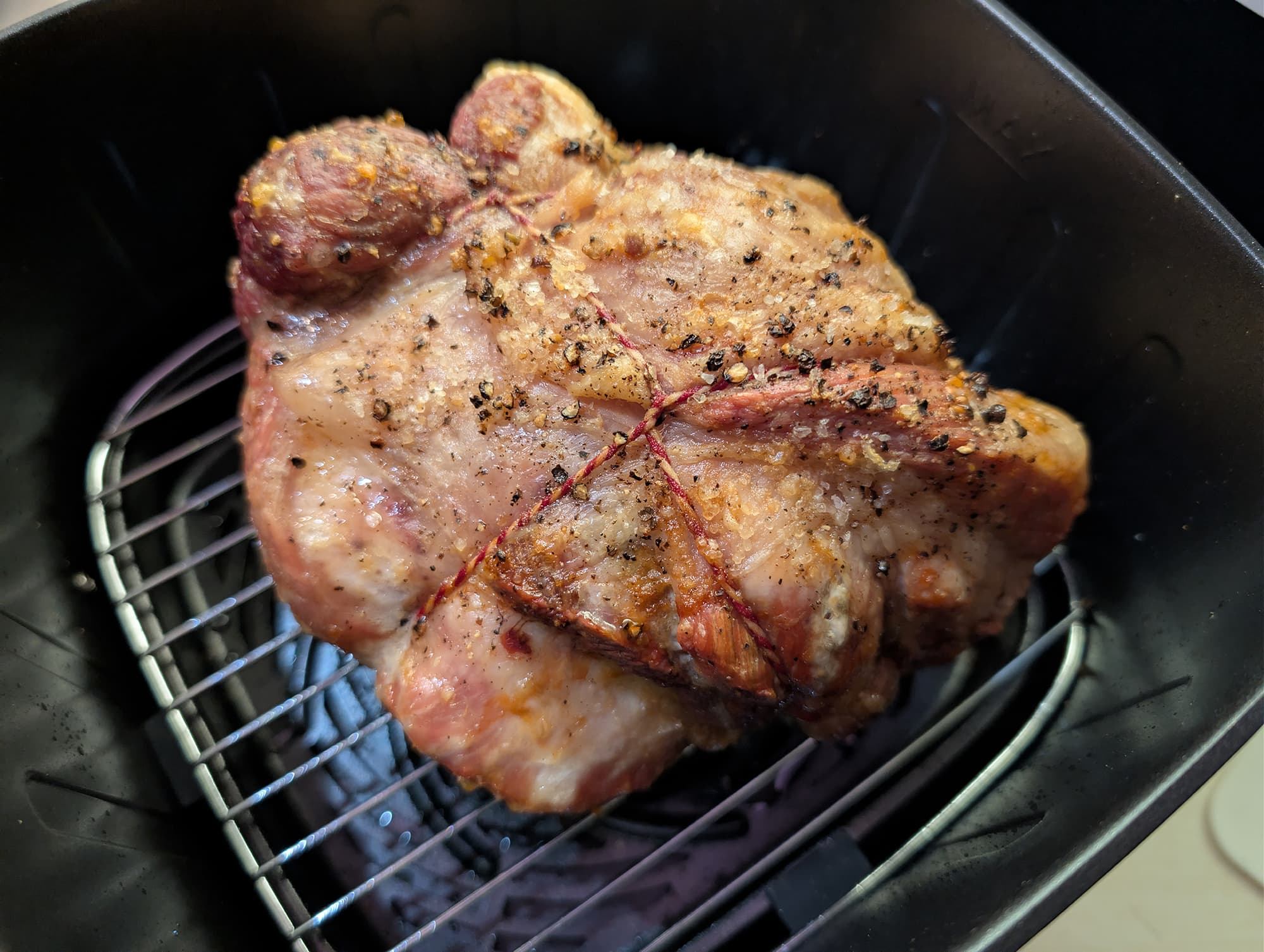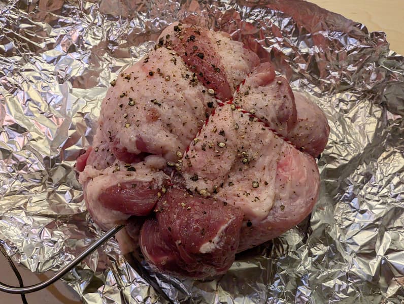 Для знакомства с ручным режимом мы взяли средний (около 1200 г) кусок свиной шеи. Выдержав его пару часов в смеси свежесмолотого черного перца и соли, мы обвязали мясо шпагатом и завернули в фольгу, подложив на дно свертка несколько зубчиков чеснока.