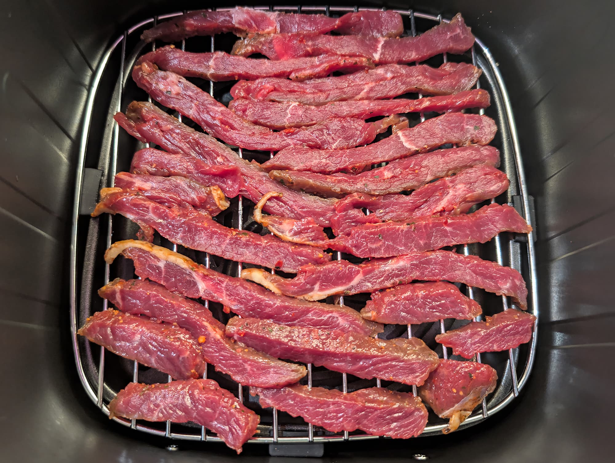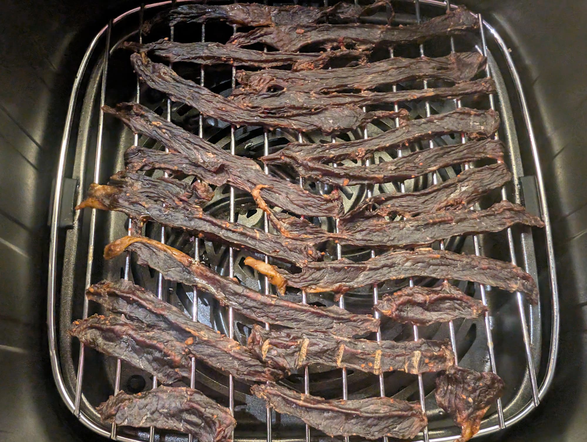 Через четыре часа сушки при 60 °C мы получили идеальное вяленое мясо: чуть тянущееся, но не сырое и не пересохшее. Отличная закуска к хорошему ячменному напитку.