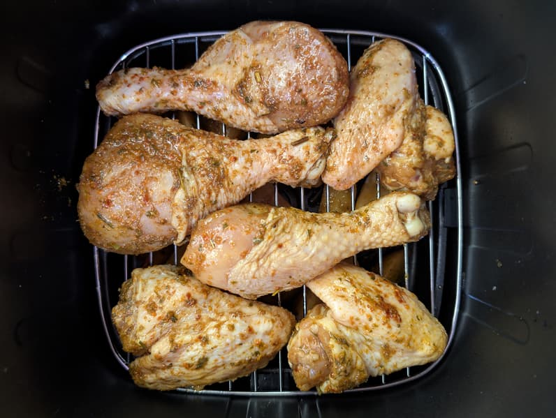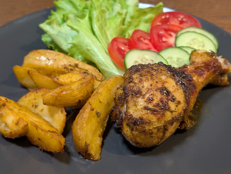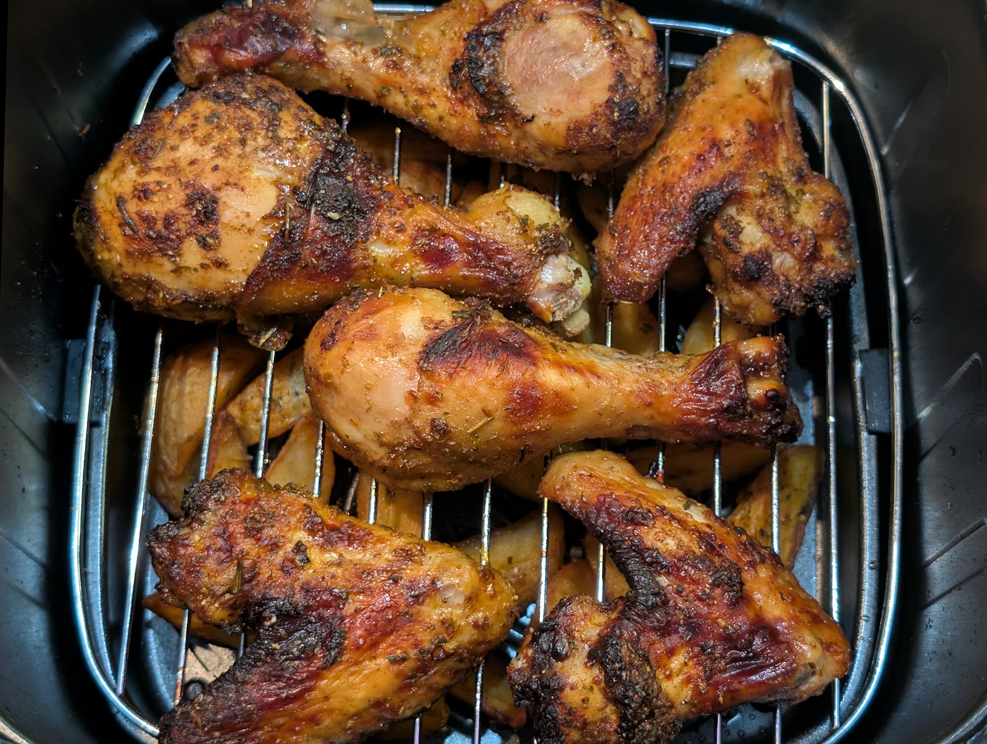 Результат нас полностью удовлетворил: голени и крылья не пересохли и покрылись румяной корочкой, а картошка на нижней решетке идеально запеклась. Простой и быстрый ужин.