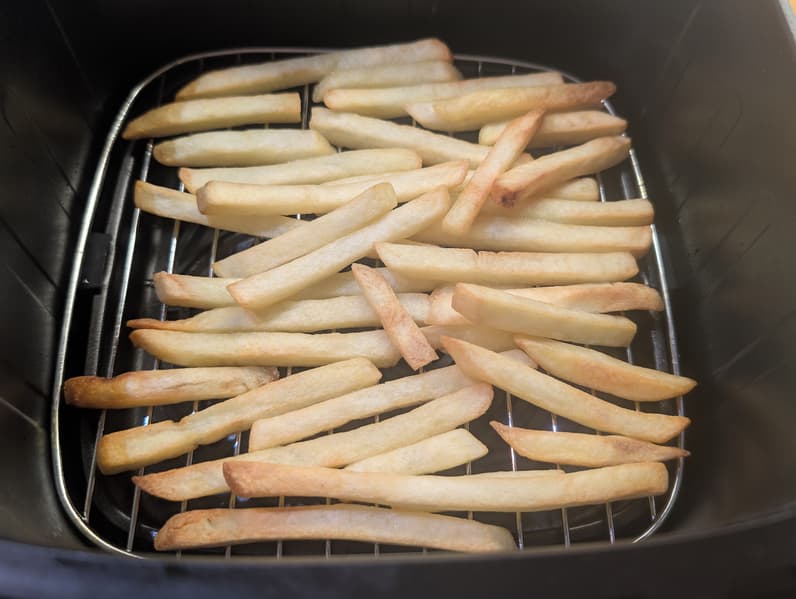 Встроенная программа перед запуском позволяет установить вес картофеля: от этого зависит время приготовления. По умолчанию (15 минут) оно рассчитано на 300-граммовую порцию, для 200 г время уменьшается до 13 минут, а полкило картошки гриль готовит 20 минут. Если вес продукта больше 300 г, перед стартом устройство напоминает о необходимости встряхнуть содержимое чаши, чтобы оно обжаривалось равномернее. Для этого в середине приготовления аэрогриль приостанавливает работу и издает звуковой сигнал.