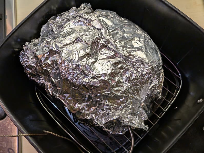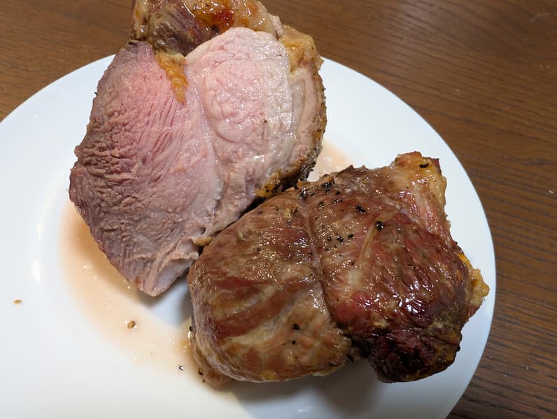 В этом опыте мы контролировали температуру внутри куска с помощью кулинарного термометра. Через 38 минут она достигла значения 72 °C. После этого мы прервали приготовление, убрали фольгу и увеличили температуру приготовления до 200 °C, чтобы получить корочку.