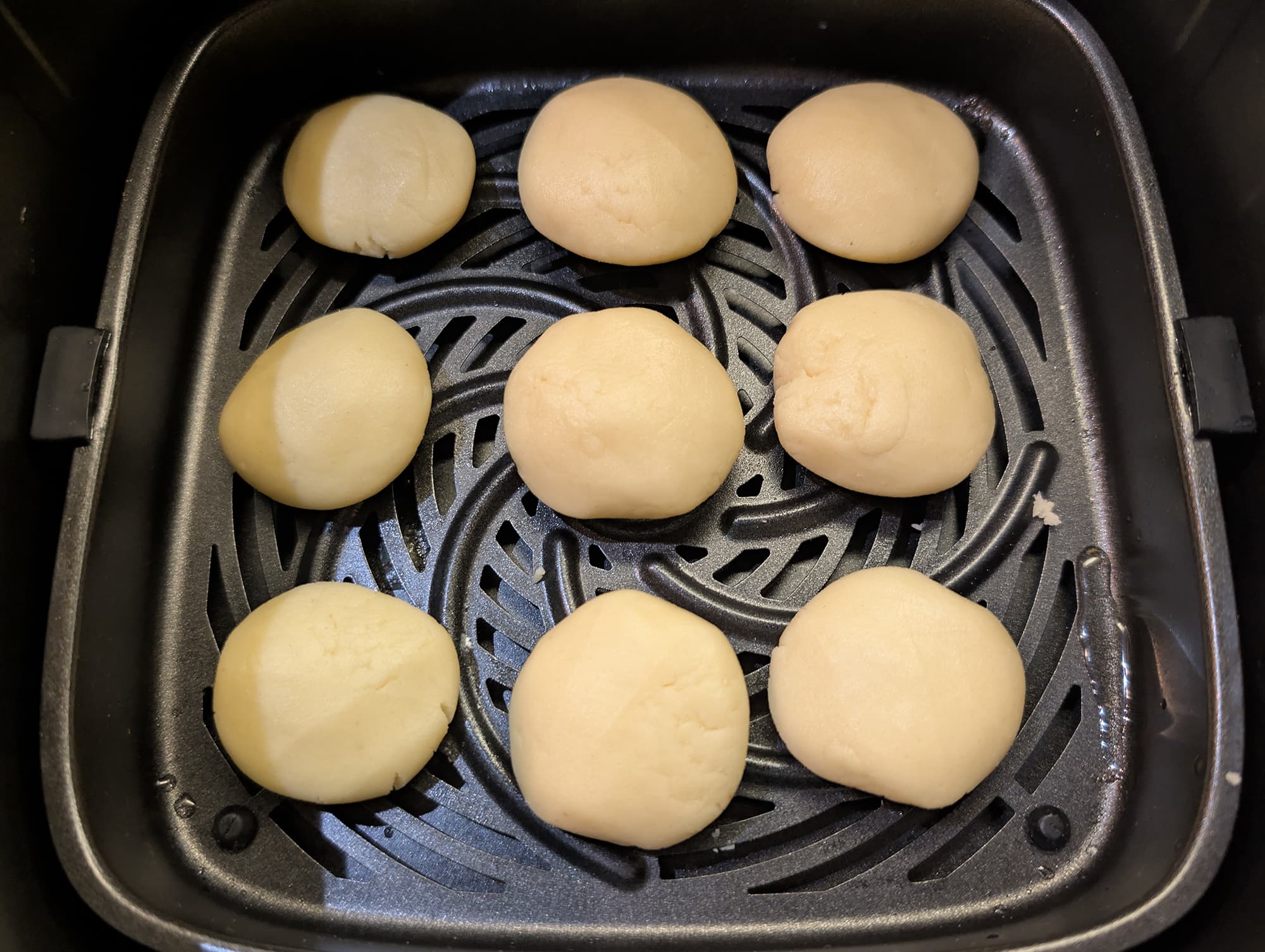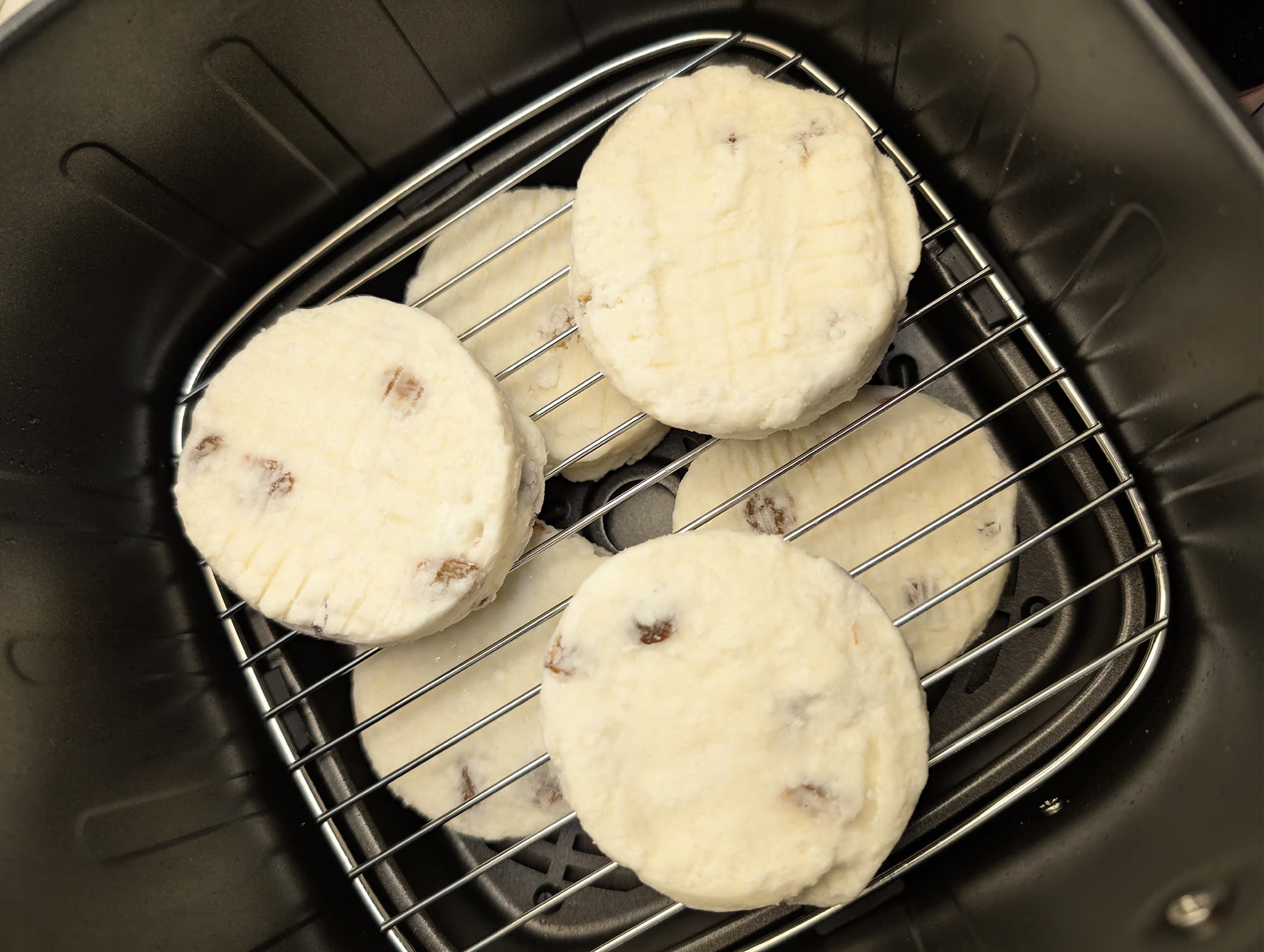 Чтобы поджарить в аэрогриле замороженные сырники, мы разложили их в два слоя — по три штуки на сетке и на решетке.