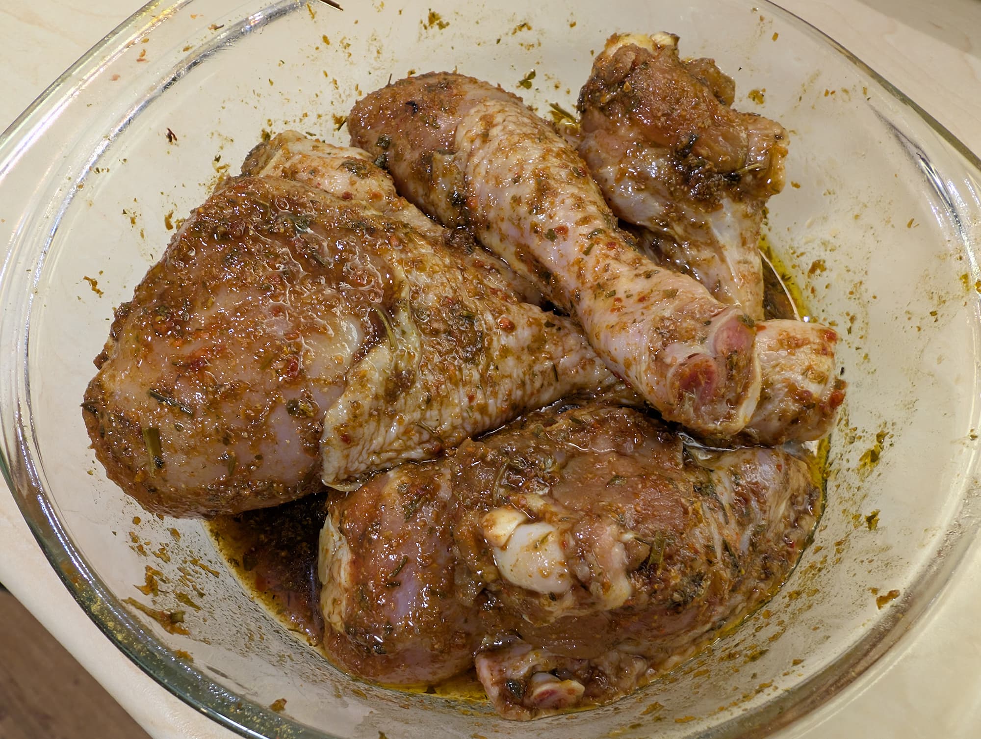 Три пары куриных конечностей — голеней и крыльев — мы замариновали в смеси соли, оливкового масла, вустерского соуса и пряностей (три вида перца, куркума и зира).