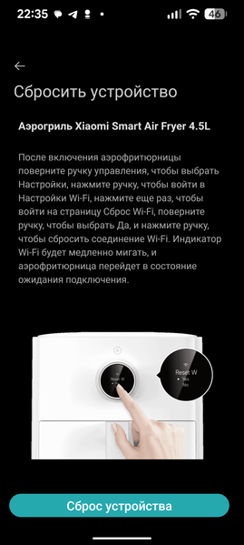 Чтобы добавить аэрогриль в наш умный дом, следует воспользоваться значком «+» в правом верхнем углу главного экрана. Устройство обнаруживается автоматически с помощью Bluetooth. При этом приложение разъясняет, как перевести его в режим сопряжения и запрашивает данные для подключения к сети Wi-Fi. Подключение занимает меньше минуты и завершается без затруднений. На последнем этапе от нас требуется назначить прибору понятный псевдоним и привязать его к одной из комнат дома.