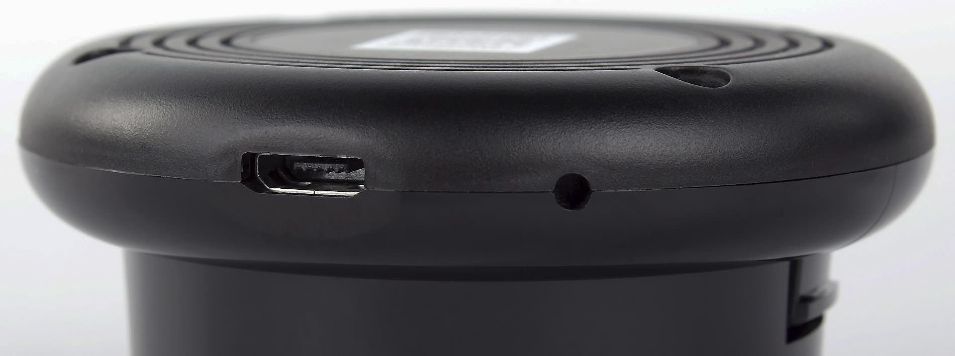 На утолщении можно заметить вход microUSB для подачи питания и слот для карт памяти microSD. Кроме того, на заднем торце находится скрытая кнопка для сброса настроек, а также решетка встроенного динамика. Отверстие микрофона разместили на ребре около порта USB. Заметим, что при использовании нештатных кабелей, стоит выбирать варианты с не очень крупным (длинным) штекером, иначе он может немного мешаться, поскольку в обычной конфигурации ориентирован вниз, в сторону шарнира подставки.