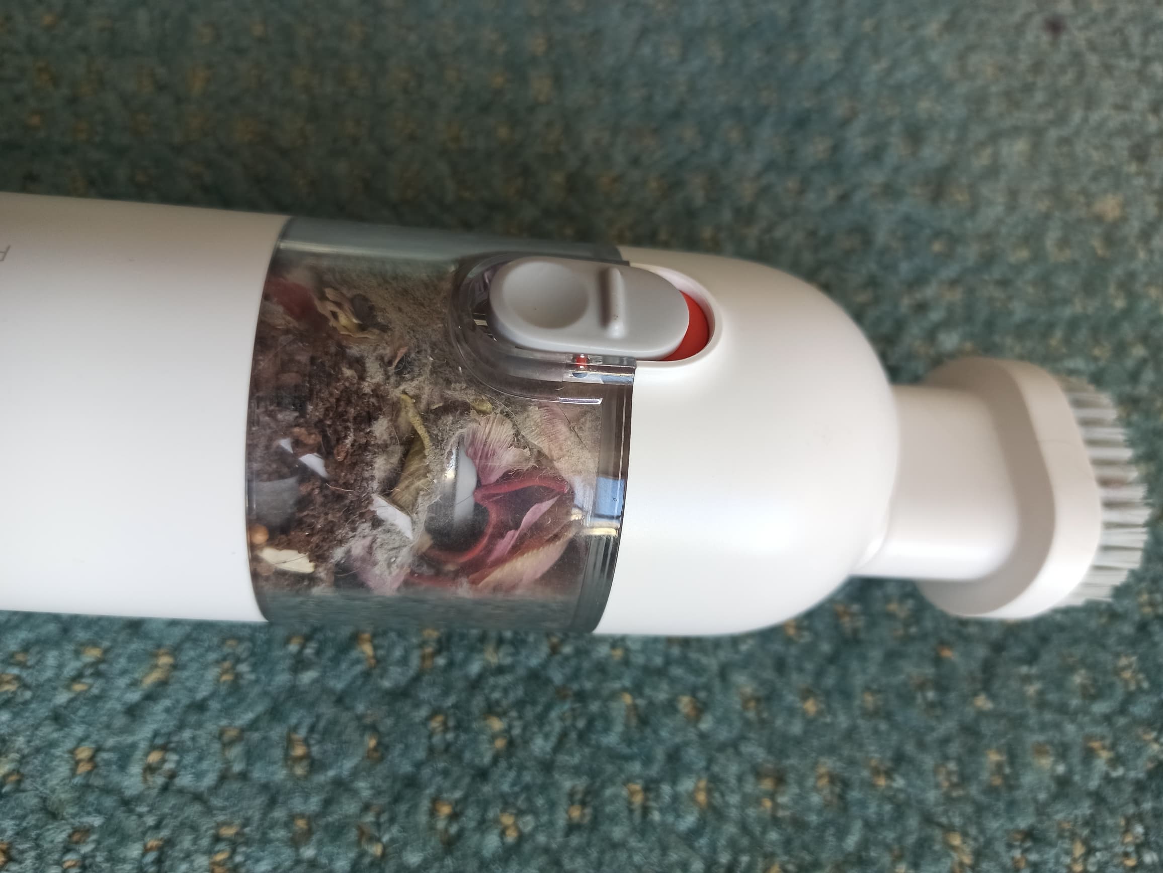 Тестировать пылесос мы начали с насадки со щеткой, просто собирая мелкий сор и пыль по дому везде, где они нам попадутся. Пылесос сам по себе легкий, диаметр круглой ручки 5,5 см позволяет удобно держать его во время работы, рука не устает. Первым делом захотелось пропылесосить клавиатуру компьютера, это было удобно сделать с помощью мягкой насадки-щетки, появление мелкого мусора в прозрачном контейнере пылесборника показало, что процесс это был продуктивным. Затем были убраны небольшие участки пола с крошками под столом, собраны крошки с обивки дивана, мелкий сор с пола в рабочей зоне кухни (разумеется, с оглядкой на то, что пылесос предназначен, всё же, для сухой чистки). На полках, полочках и молдингах была также собрана найденная там пыль. Удобно было пройтись по горизонтальной поверхности верха книг, стоящих на открытых книжных полках и самим полкам. Мягкая щетина насадки-щетки позволила свободно маневрировать по изгибам выдающихся настенных декоративных элементов, очищая их от пыли. Пылесос эффективно подхватывал мелкий сор, крошки, пыль, которые тут же оказывались в пылесборнике, и были видимы благодаря его прозрачным стенкам.