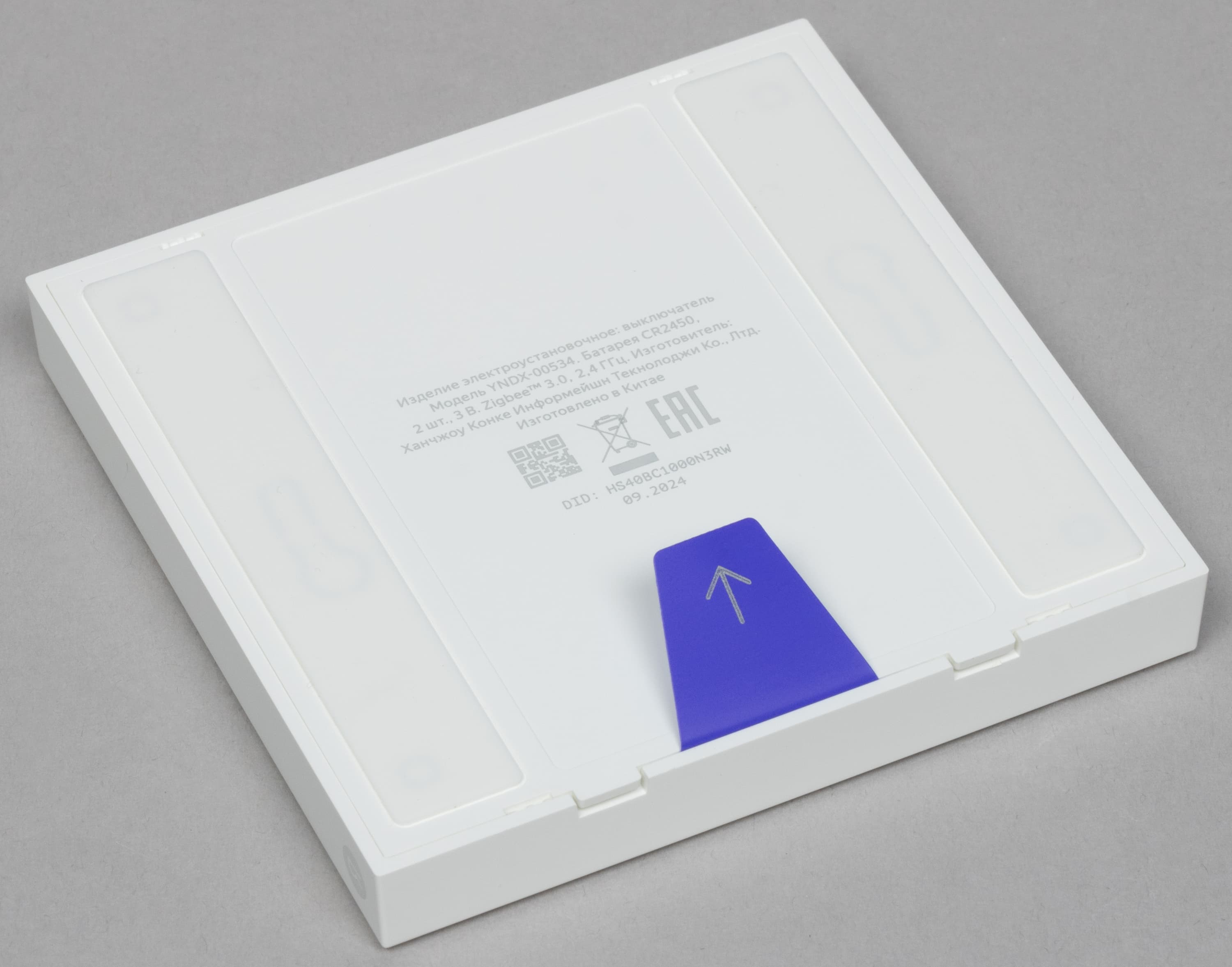 На задней стенке размещены две силиконовые накладки, благодаря которым выключатели уверенно держатся на горизонтальной поверхности и не скользят по ней — их можно без дополнительной фиксации положить на прикроватный столик, например. Если отклеить накладки, под ними обнаружатся вырезы для крепления с помощью саморезов, ну и всегда есть вариант воспользоваться комплектным кусочком двустороннего скотча.