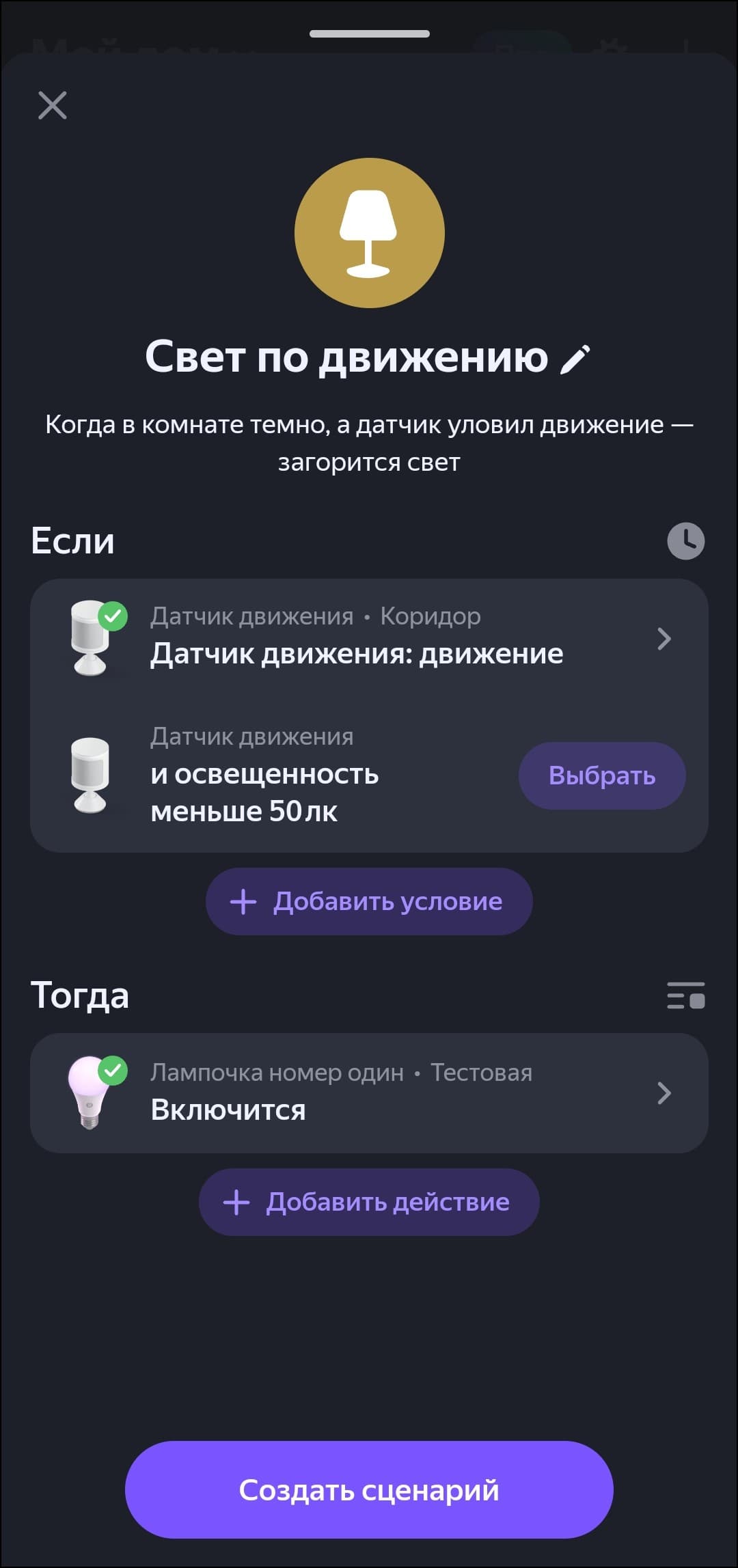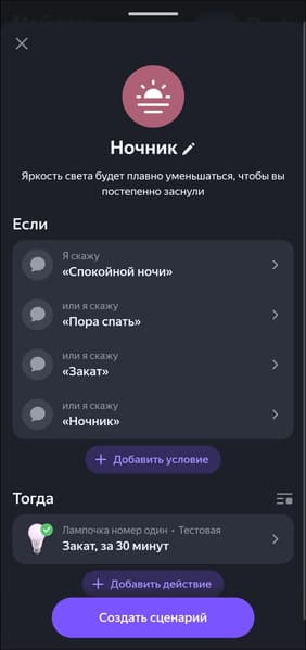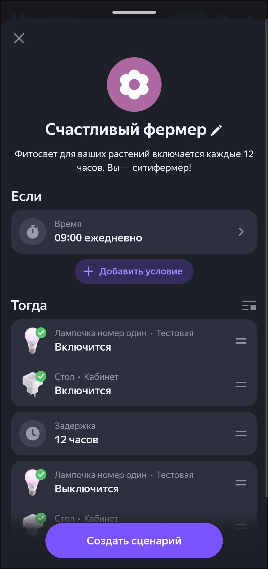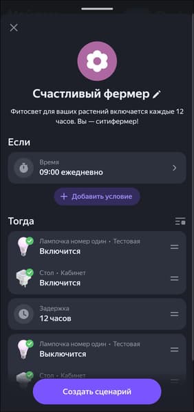 Также в приложение добавлен каталог сценариев, что очень пригодится на этапе освоения управлением умным домом. Есть все базовые действия — от включения света по движению с помощью соответствующего датчика до будильника, ночника и даже управления фитосветом.