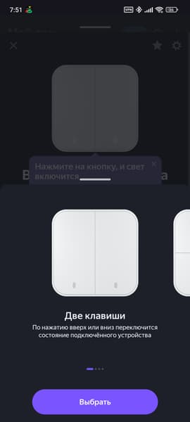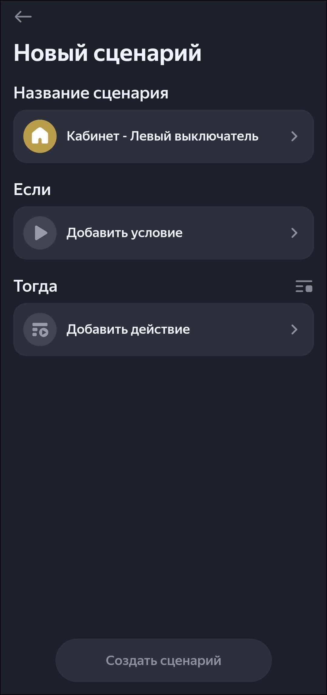 Двухклавишный выключатель добавляется в систему как четыре смарт-кнопки, одноклавишный — соответственно, как две. Каждая поддерживает три типа нажатия, на которые помимо включения и выключения света можно «повесить» переход в «режим чтения», например. Или вообще включение других устройств. Делается это через стандартную процедуру добавления сценария.