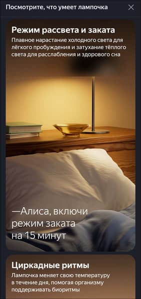 Список доступных из приложения и с помощью голосового ассистента опций здесь точно такой же, как у прочих RGB-ламп, рассмотренных выше.