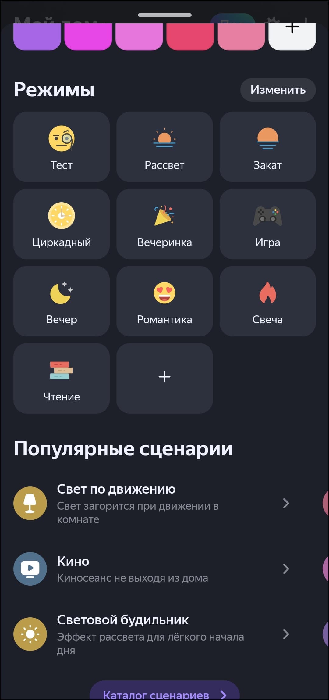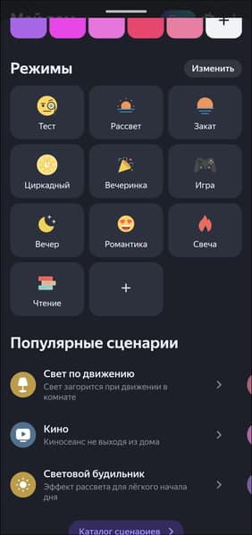 Предустановленных режимов много, отображение некоторых на главной можно отключить. Реализована и возможность создавать собственные: выбираем имя, иконку, добавляем цвета и способ их смены — готово. Новый режим появляется в общем списке и доступен для выбора как через интерфейс ПО, так и с помощью голосового ассистента.