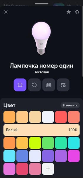 Доступные в приложении и через голосового ассистента функции те же, что и у «обычной» лампочки без возможности смены цвета: от настройки температуры и яркости до добавления в группы и сценарии.