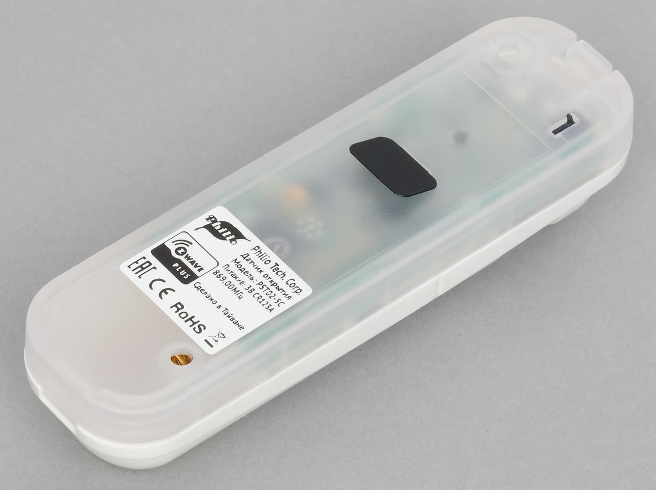 Если же хочется исключить батарейки, то пригодится комплектный кабель Micro-USB—USB. Он сам плоский и имеет разъем специальной формы. Потребление в режиме ожидания не превышает 35 мА. В случае питания через порт USB, устройство работает постоянно и реализует режим повторителя сети Z-Wave. Если же применяются батарейки, то реализуется режим сна, и помочь в расширении зоны сети Z-Wave устройство не сможет. Также надо отметить, что назначение режима работы производится в момент включения в сеть. То есть в случае изменения способа питания потребуется переподключение датчика к контроллеру. Кстати, порт Micro-USB используется и для обновления прошивки датчика, причем эту операцию может провести и конечный пользователь.
