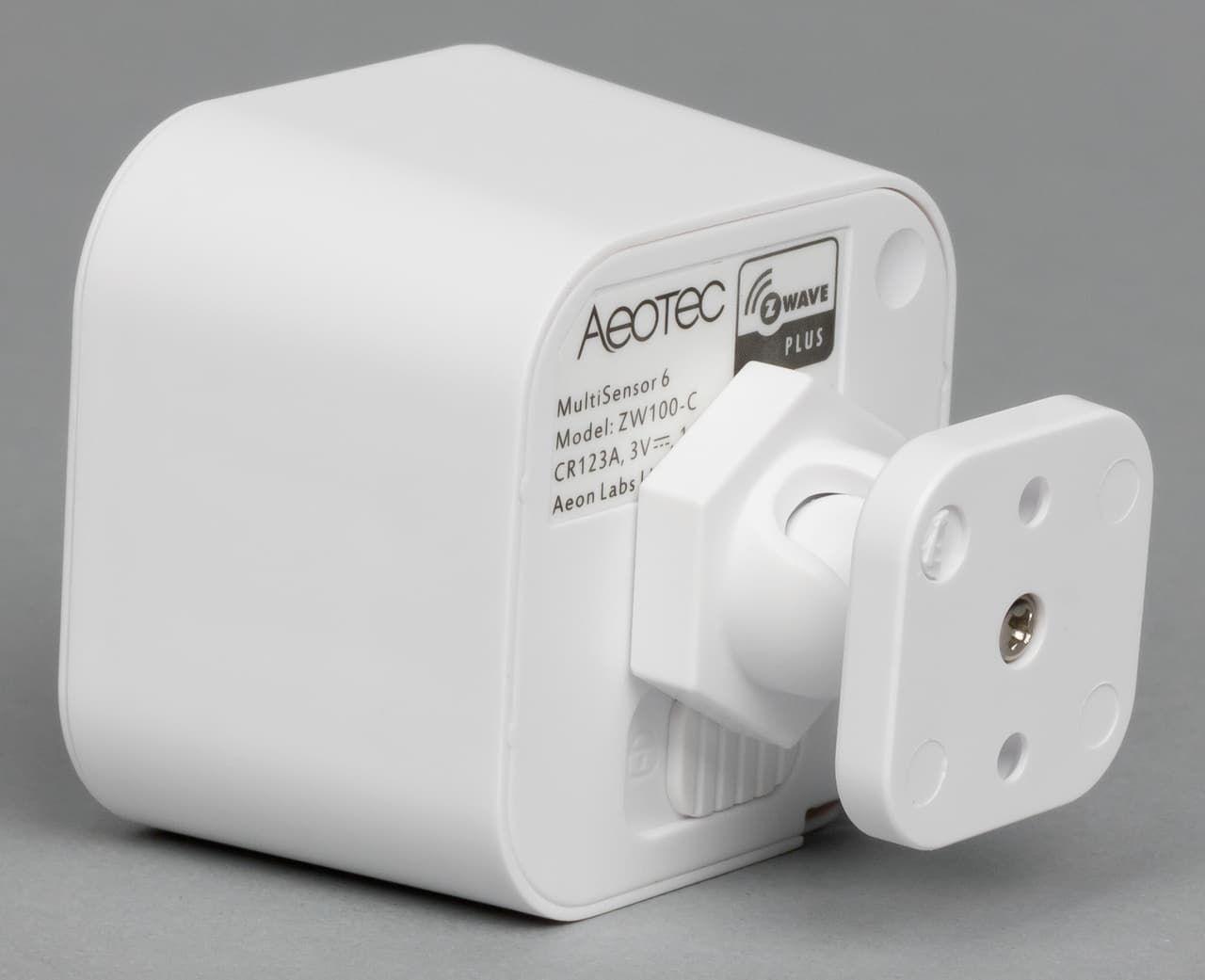 Корпус датчика изготовлен из белого матового пластика. Габаритные размеры составляют примерно 46×46×40 мм. На передней стороне корпуса находится линза сенсора движения. По диагональным углам от нее — многоцветный индикаторный светодиод и датчик освещенности/UV. Задняя крышка съемная. За ней находится отсек для батарей и порт Micro-USB. В ее центре мы видим резьбовое крепление для шарнира. Один из углов используется как кнопка для включения датчика в сеть Z-Wave, исключения из нее и операции «разбудить». Обратим внимание, что явных отверстий для сенсоров температуры и влажности на корпусе нет, так что возможно оценка этих характеристик помещения будет происходить с некоторой задержкой. Весит устройство всего ничего — 35 г без элементов питания, 50 г с одной батареей и 65 г с парой батарей.
