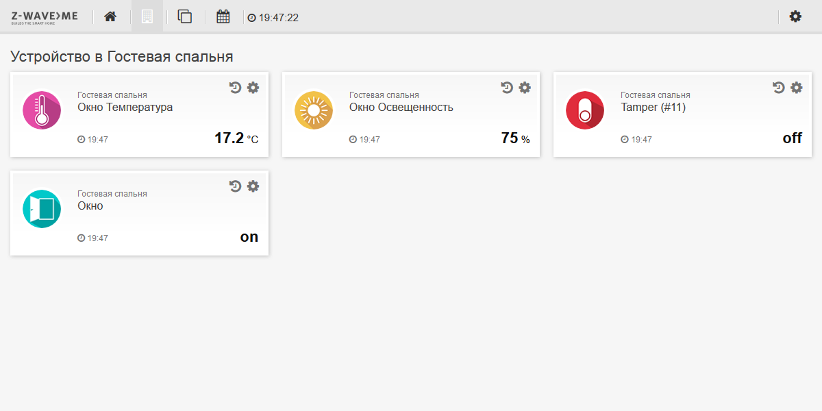 На контроллере модель отображается в виде трех устройств. Их интерпретация будет зависеть от программного обеспечения. Как и описанной выше модели мультисенсора, в данном устройстве реализован контроль качества сети Z-Wave c использованием встроенного многоцветного светодиода. В документации можно найти описание параметров датчика, среди которых есть настройка отправляемых при срабатывании команд, порог контроля уровня и частота проверки заряда батареи. Сложностей с интеграцией в Z-Way мы не встретили. Сенсор можно использовать для охраны, контроля климата и других сценариев.