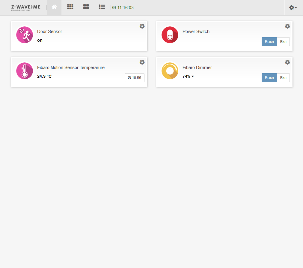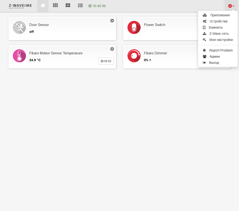 Для подключения нового устройства нужно зайти в системное меню, доступное по шестеренке в правом верхнем углу экрана, и выбрать в нем пункт «Устройства». Данная реализация поддерживает работу только с Z-Wave, так что далее выбираем эту кнопку и включаем на контроллере режим поиска новых устройств, который сопровождается миганием синего светодиода в адаптере.