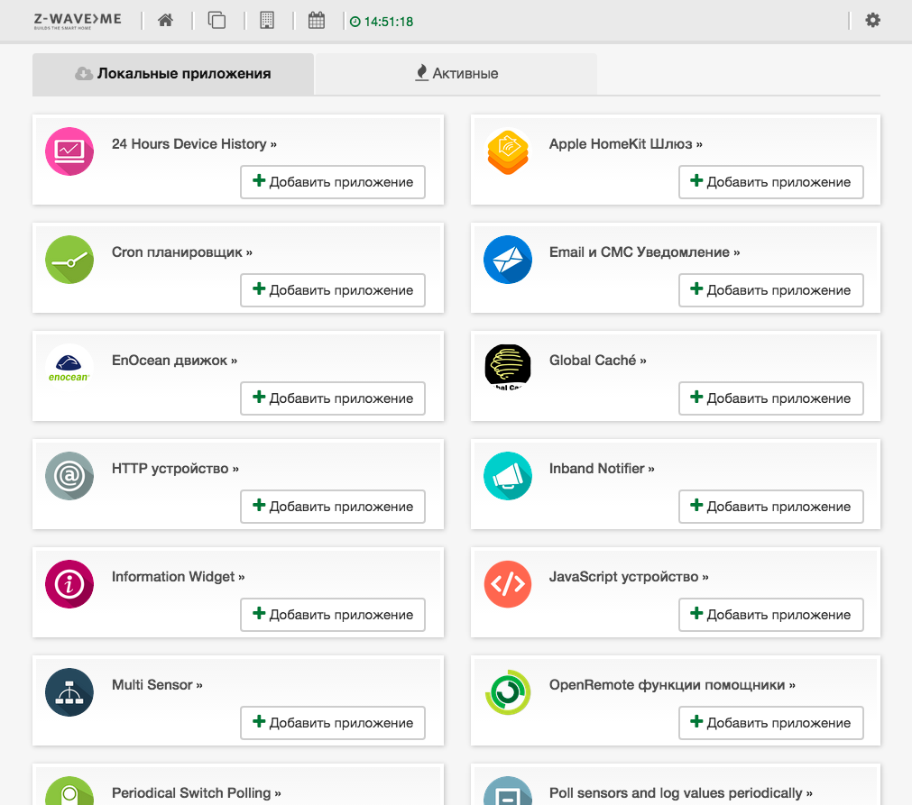 Данный интерфейс будет полезен для настройки, контроля и управления системой, однако все-таки обычно под автоматизацией понимаются не требующие вмешательства человека сценарии. В рассматриваемом продукте эта функция называется «Приложения». При выборе соответствующего пункта в системном меню мы видим список доступных к использованию сценариев и программных модулей.