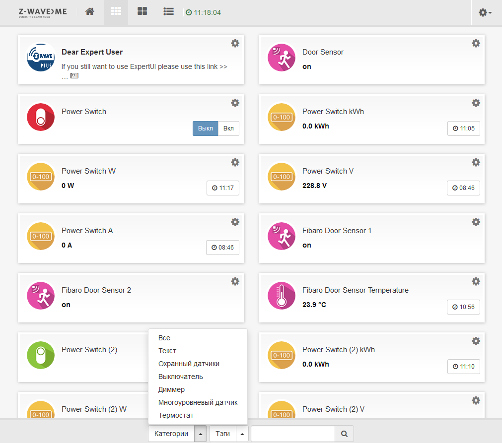 Эту операцию нужно повторить с каждым устройством. Некоторые многофункциональные модели представляются в системе как несколько независимых устройств. Например, описанные выше выключатели Aeotec кроме коммутации нагрузки предоставляют информацию о напряжении питания, потребляемой мощности, токе и общем потреблении в кВт·ч.